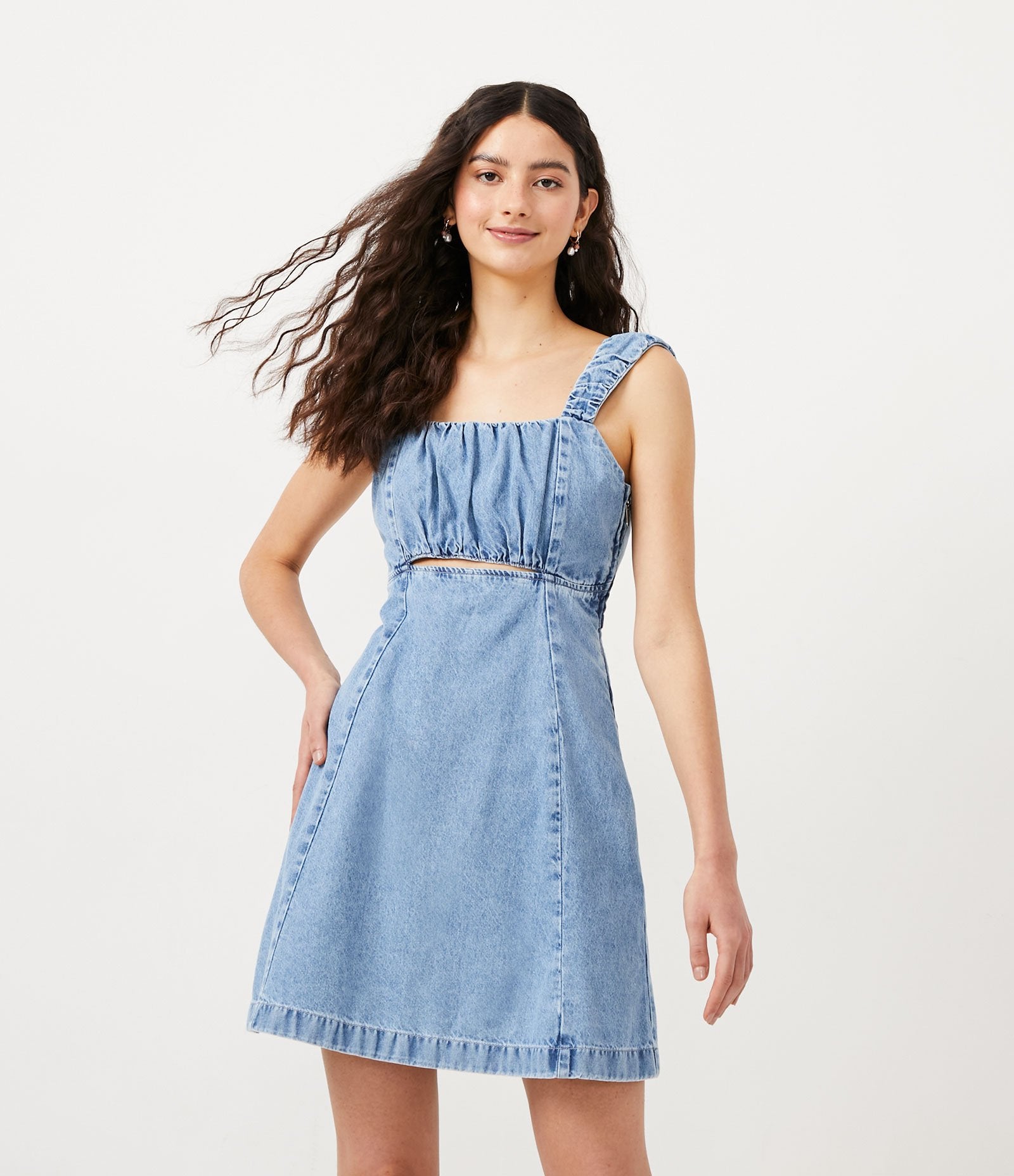 Vestido corto vaquero con tirantes fruncidos y recorte delantero en azul