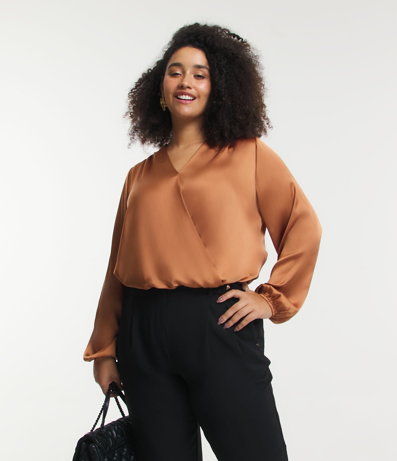Blusa de Raso con Curva Envolvente Delantera y Tallas Grandes Marrón