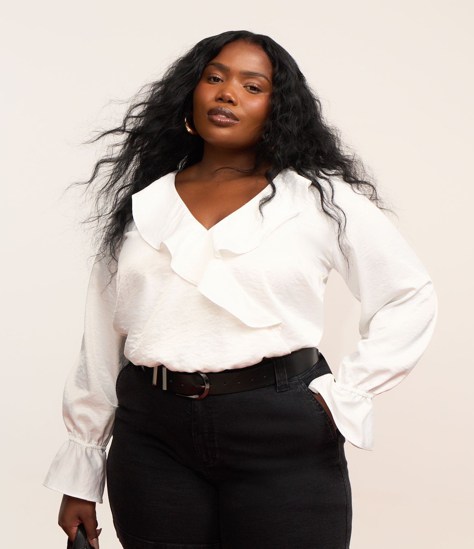 Blusa envolvente de satén blanco con volante Jabot, Curve y Tallas Grandes