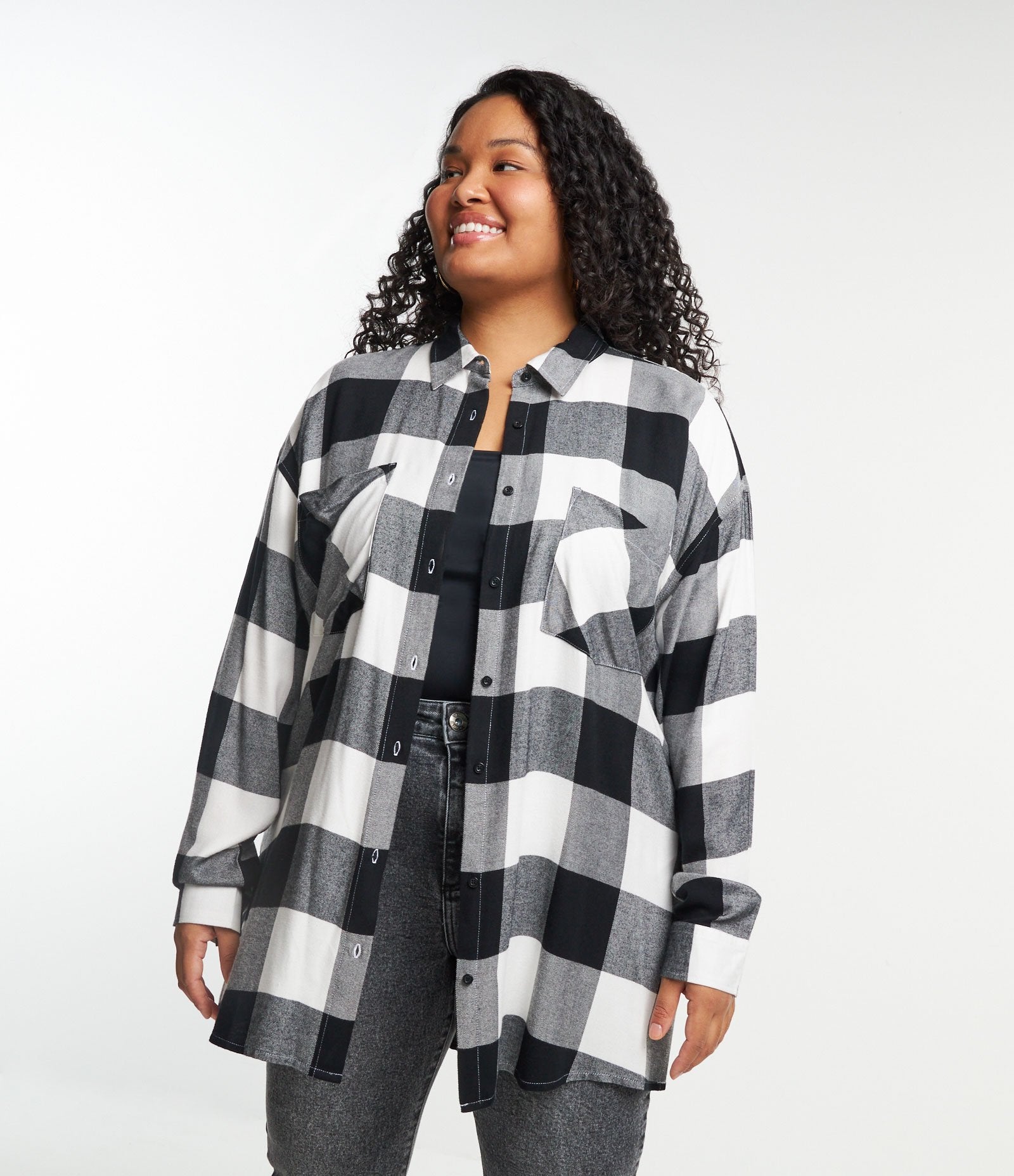 Camisa de franela a cuadros con bolsillos, Curvas y Tallas Grandes, Blanca/Negra