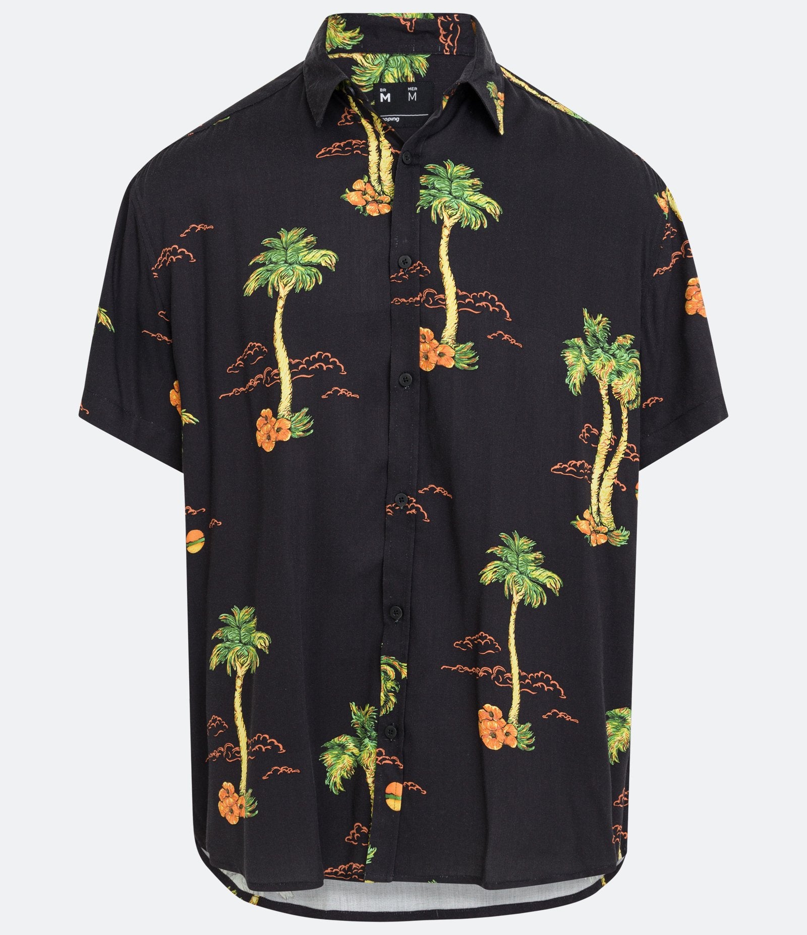 Camisa relajada de viscosa con estampado negro de sol tropical y palmeras