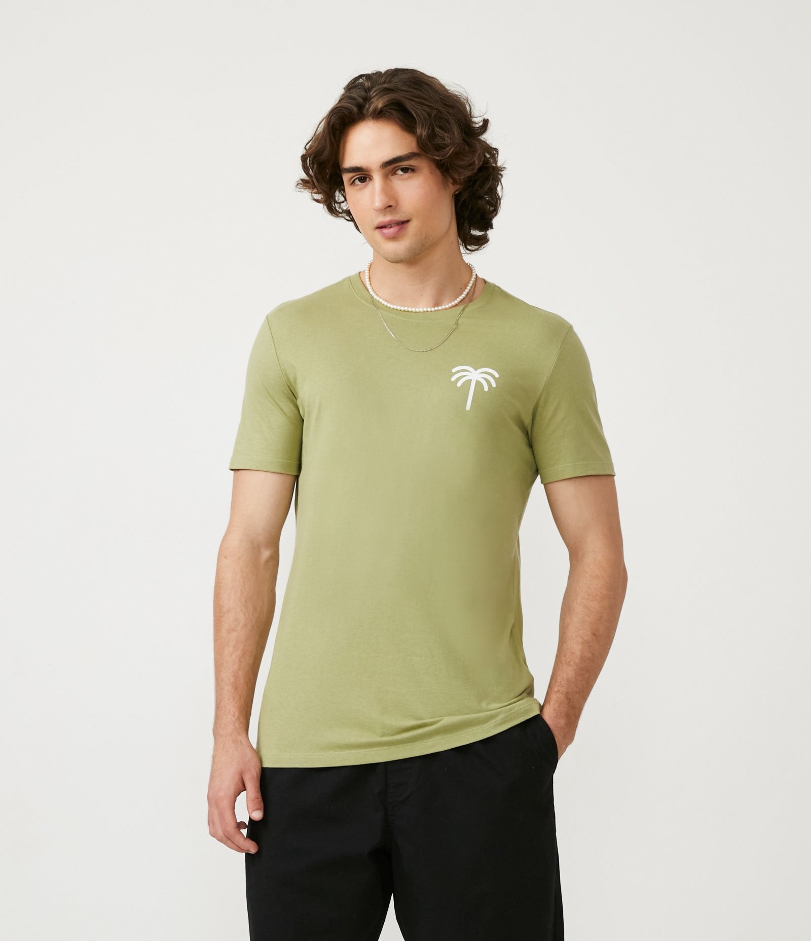 Camiseta de algodón de manga corta con estampado de palmeras delante y detrás - Verde