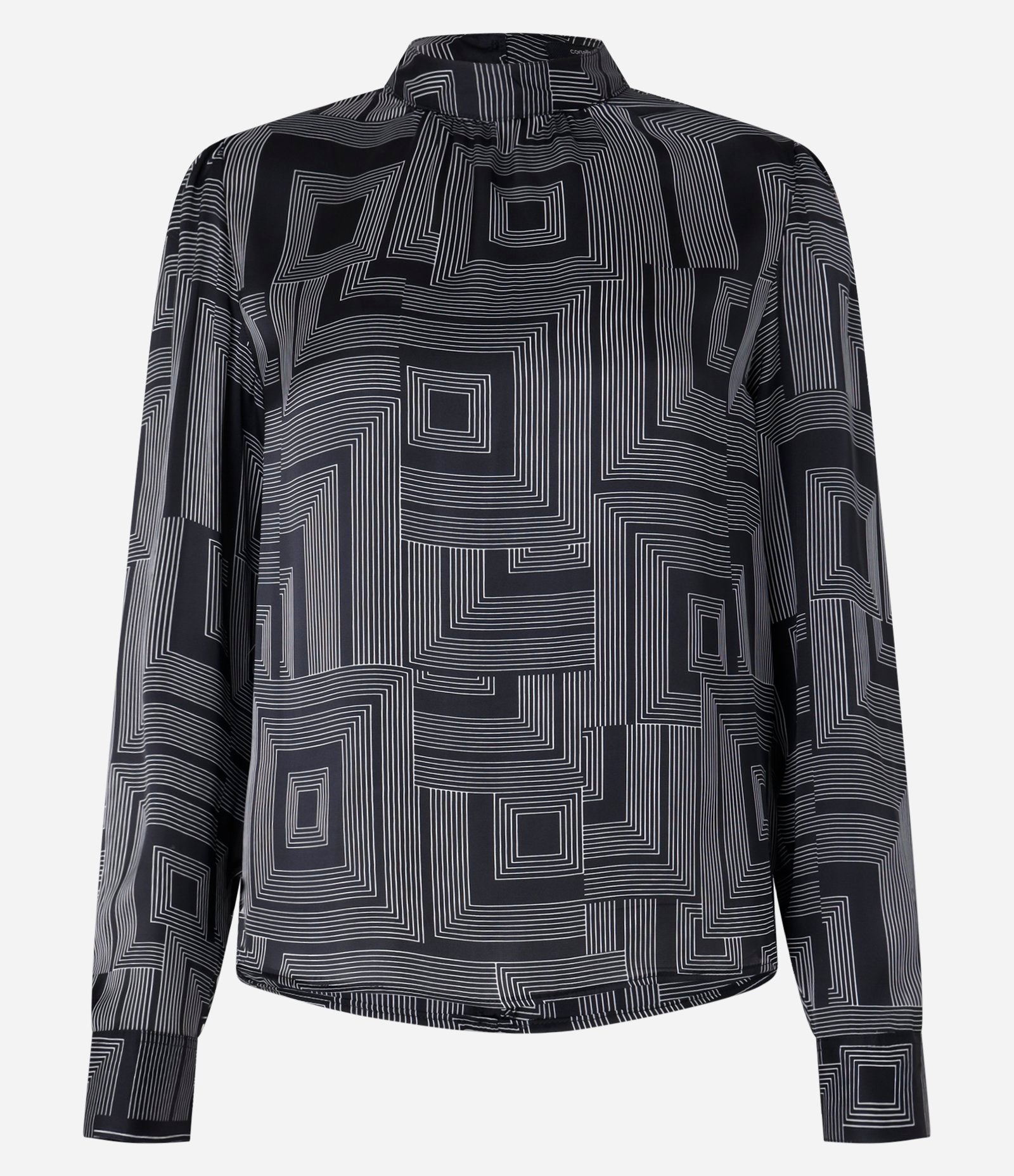 Blusa de satén con cuello mandarín y estampado geométrico negro