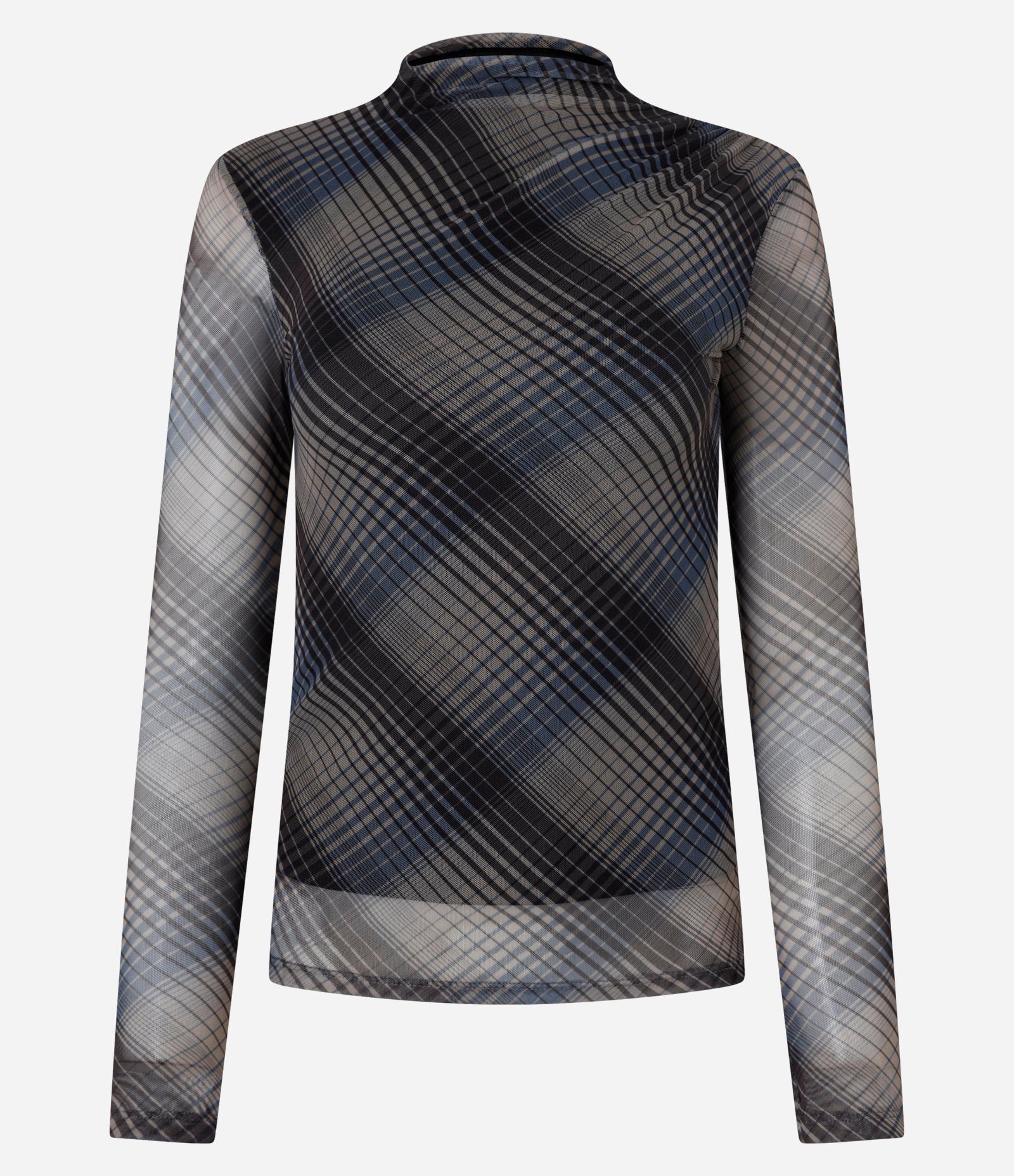 Blusa de Tul de Cuello Alto con Estampado de Cuadros Gris/Negro/Azul