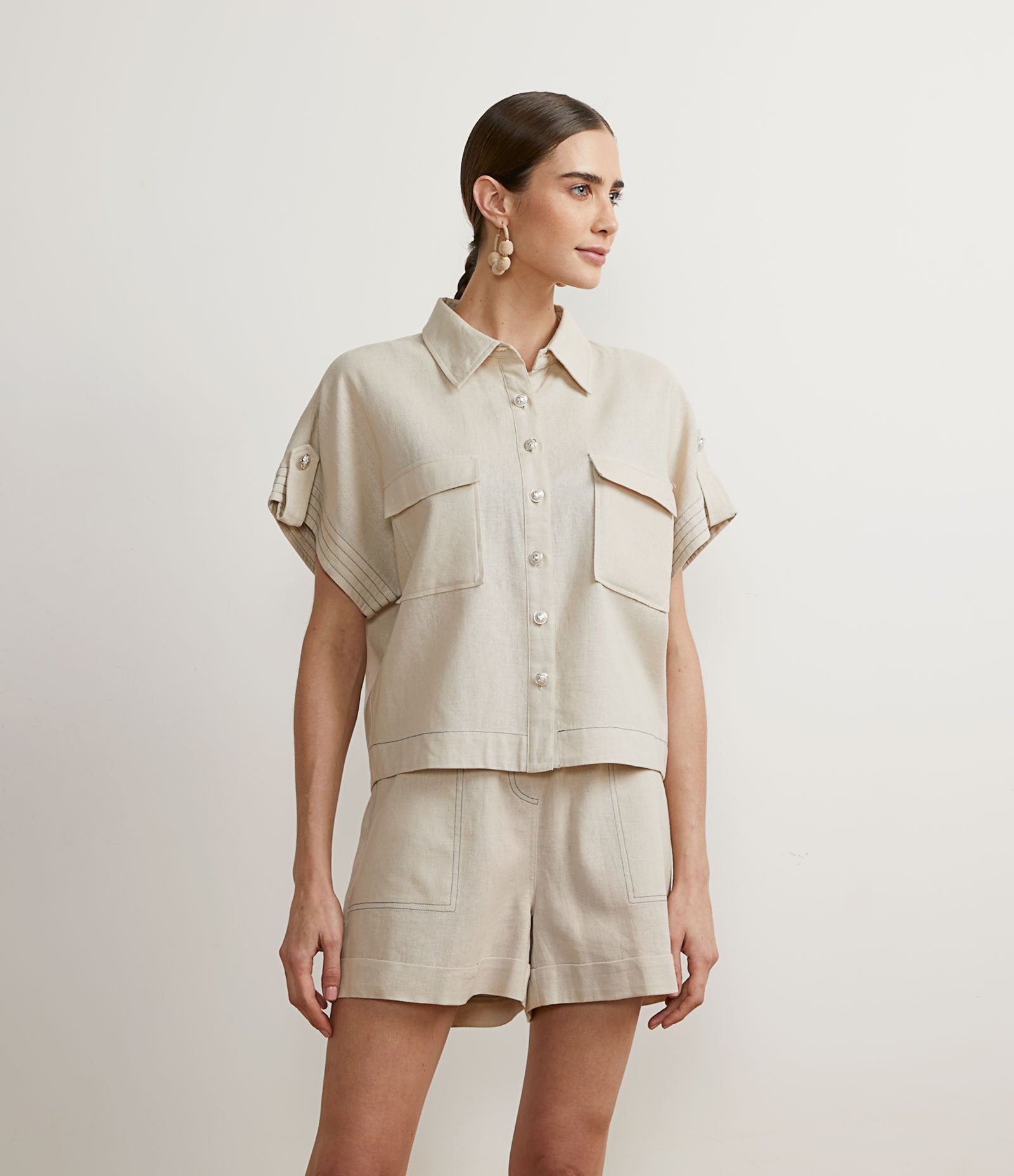Camisa de viscosa con mangas cortas y detalle de pespunte beige