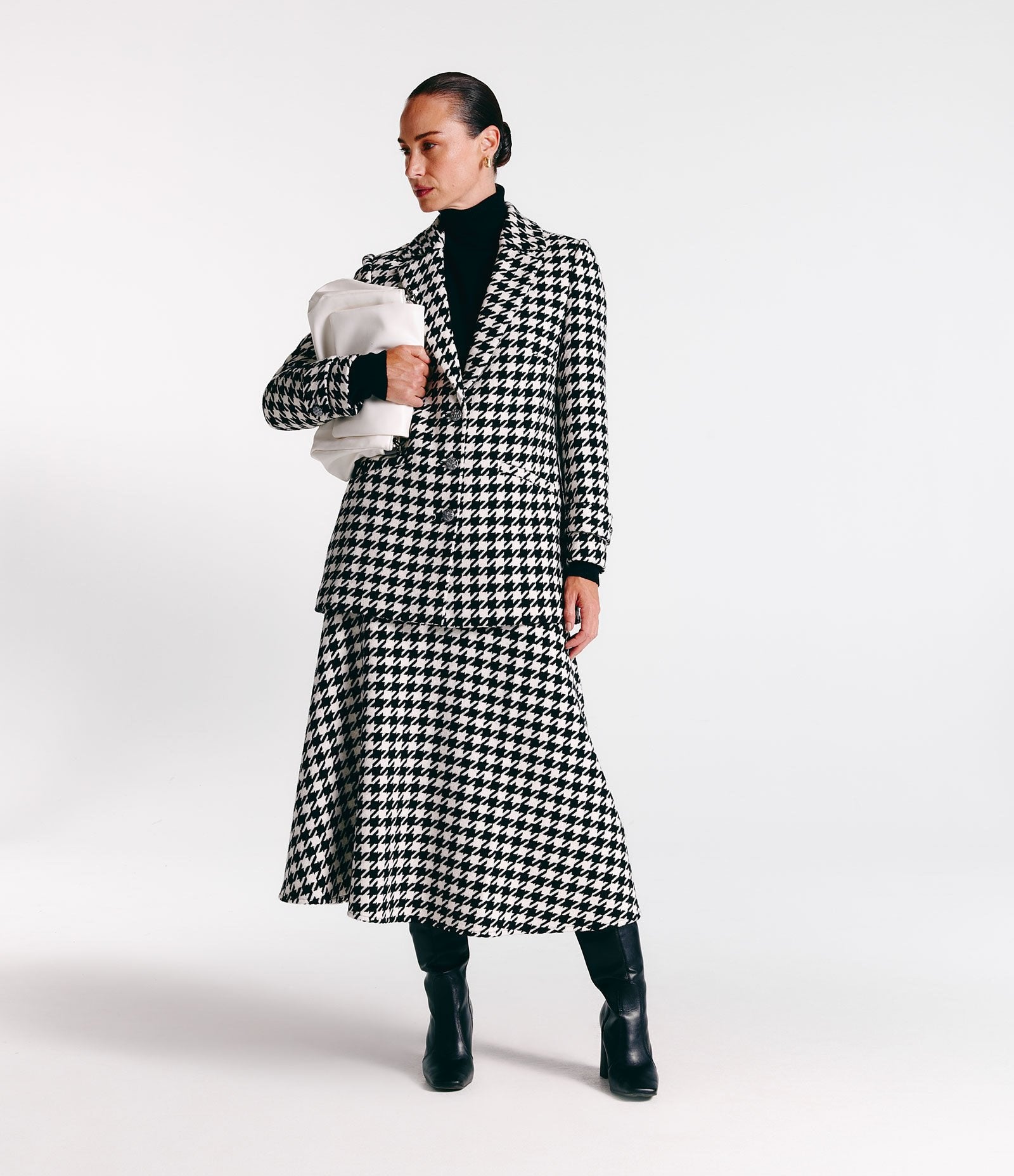 Midi Falda de Tweed en línea A con estampado de pata de gallo negro de Cortelle - Experimenta la mezcla perfecta de comodidad, calidad y estilo en cada pieza.