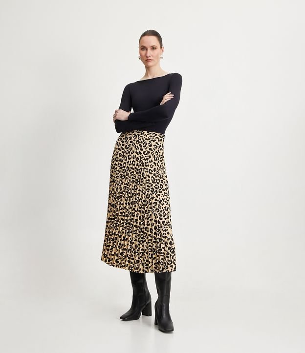Falda Midi Plisada en Crepé Beige Animal Print by Cortelle - Experimenta la mezcla perfecta de comodidad, calidad y estilo con cada pieza.