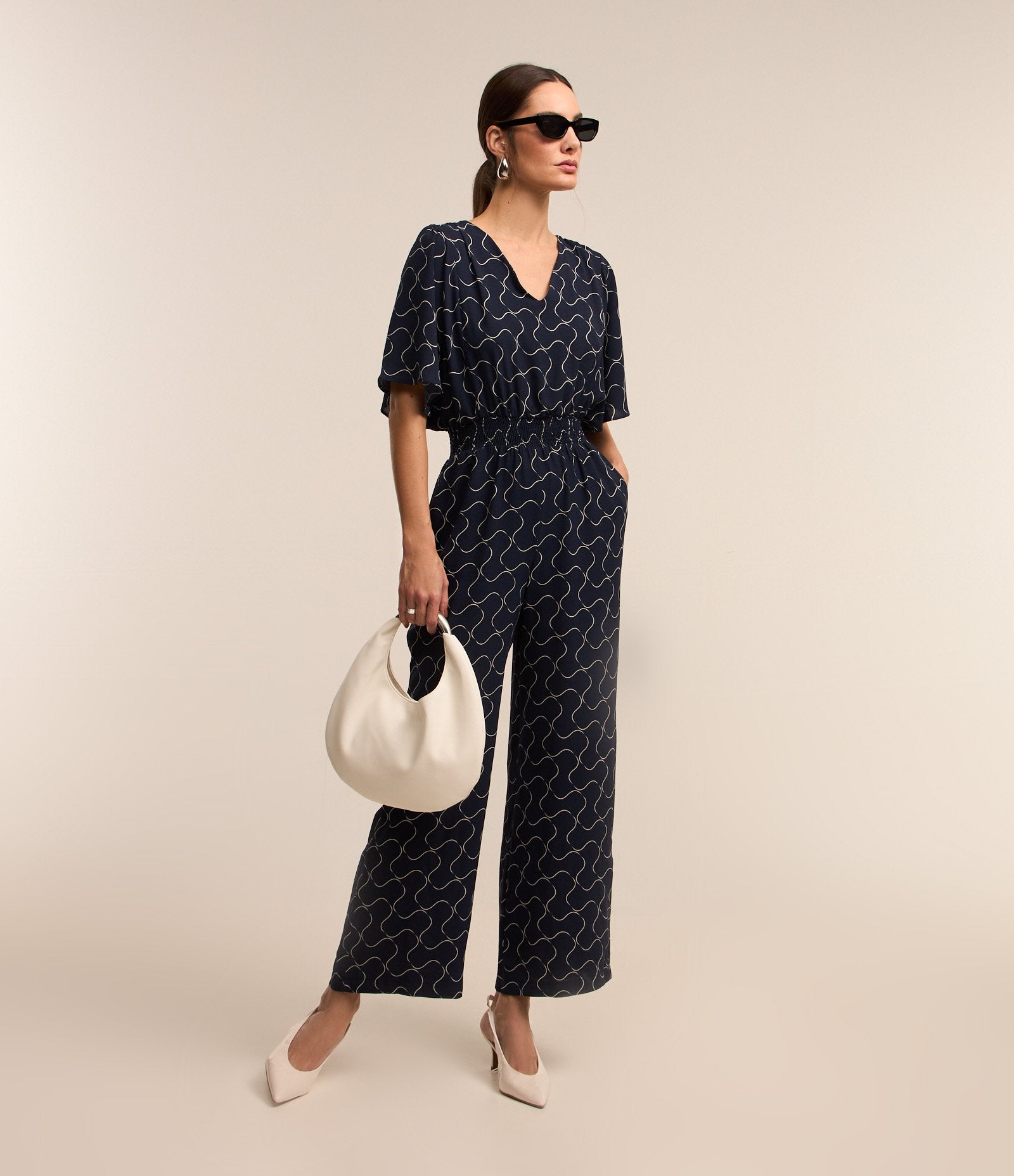 Mono largo en tejido Airflow con cintura fruncida y estampado abstracto azul oscuro de Cortelle - Experimenta la comodidad, la calidad y el estilo en cada pieza.