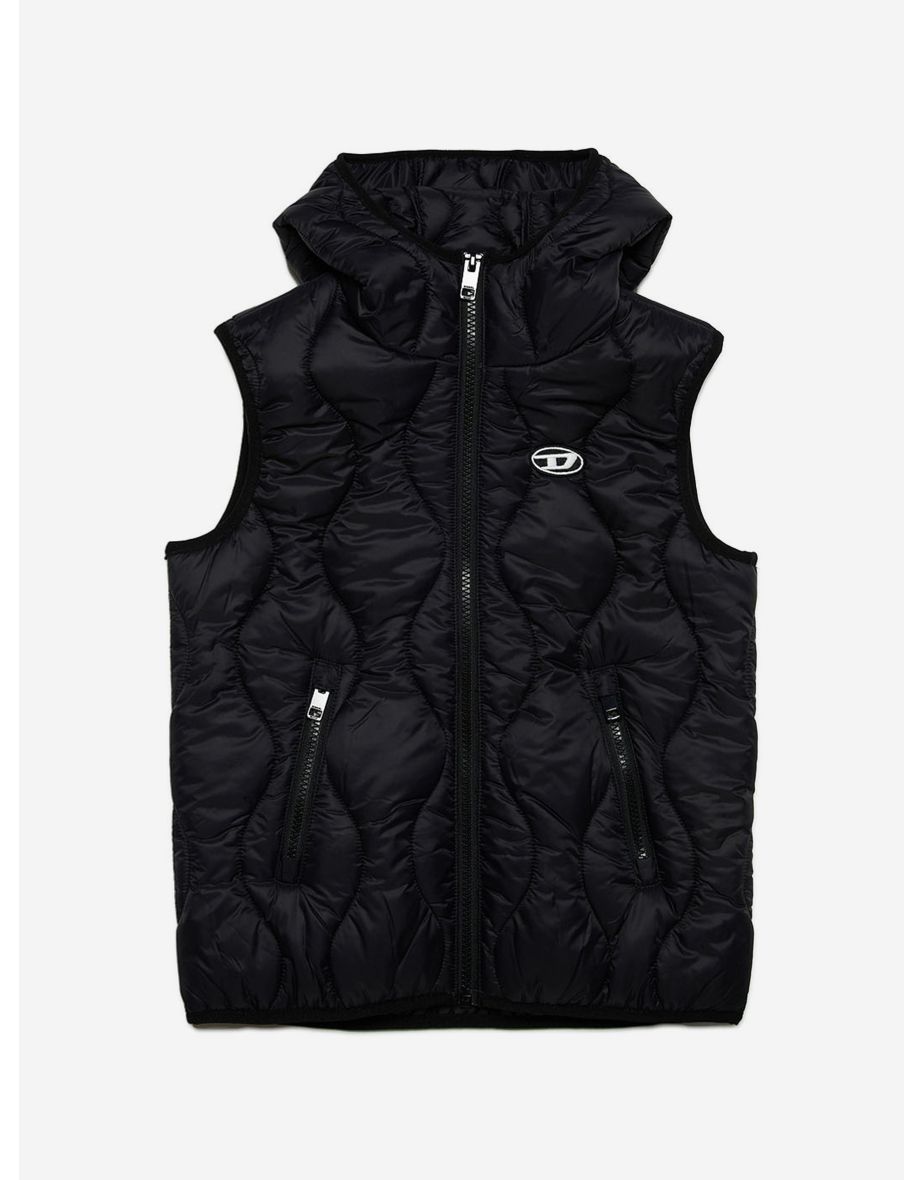 El chaleco acolchado infantil Diesel de color negro es la elección ideal para conjuntos informales y ropa de diario.