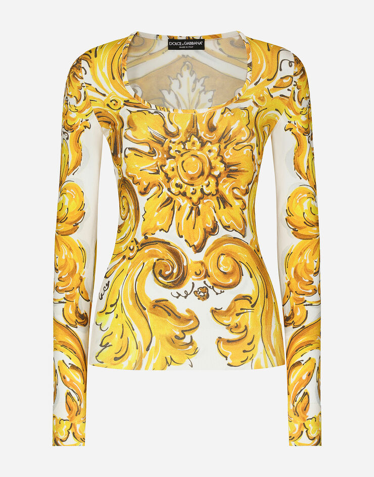 El Jersey Dolce & Gabbana de manga larga de viscosa elástica, con un impresionante estampado de mayólica, es la elección ideal tanto para los looks esenciales como para la elegancia cotidiana.