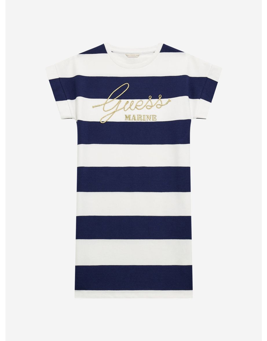 El Vestido de rayas azul marino para niña de Guess es la elección ideal para salidas informales y para el día a día.