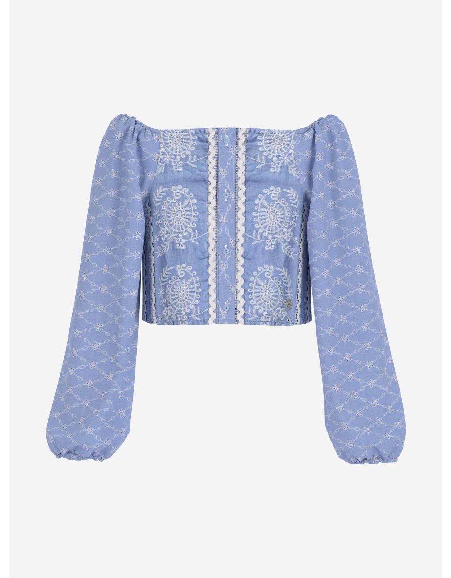 Blusa Oxford azul con detalle de encaje ojal para niña