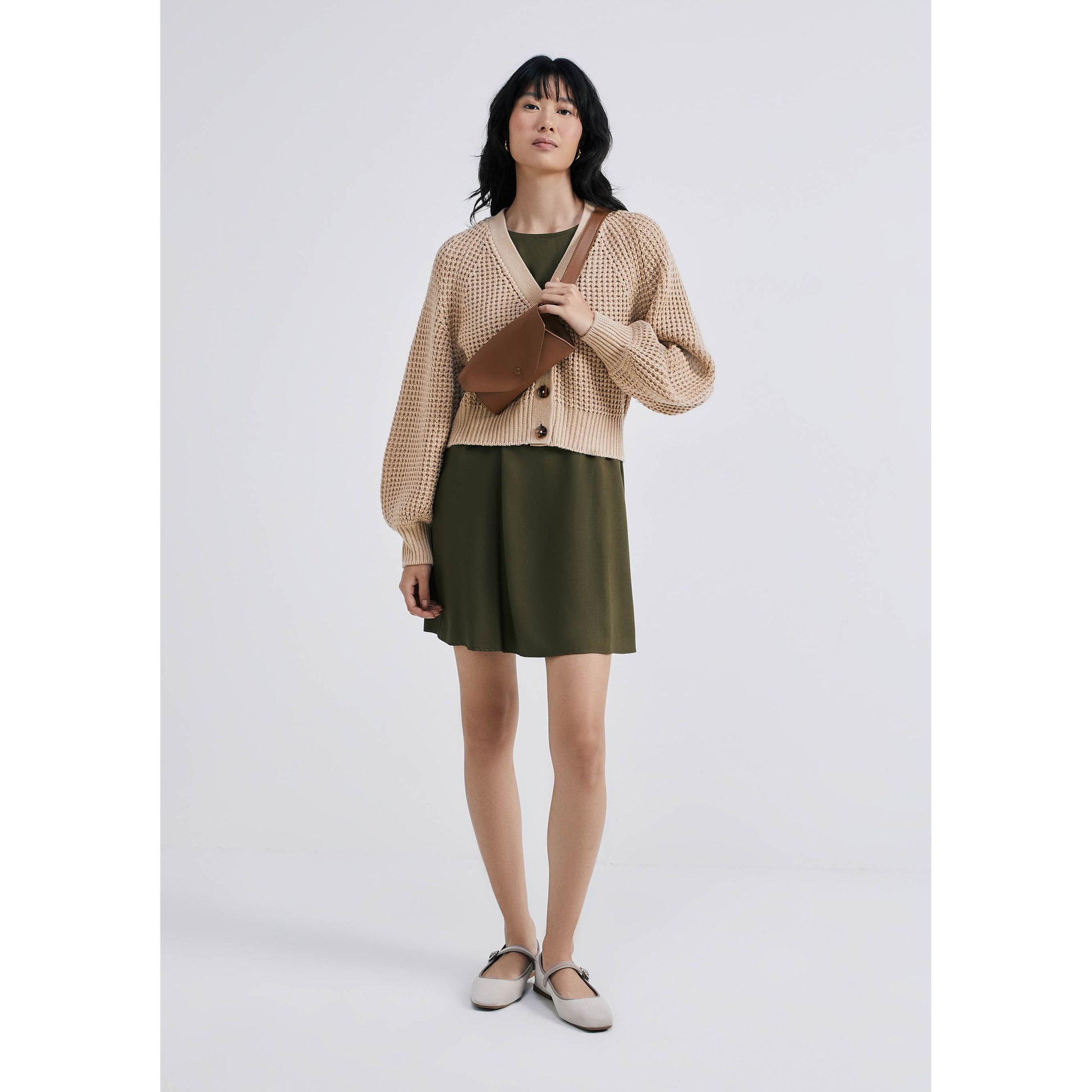 El cárdigan de punto con cuello en V para mujer - Beige, talla P de Hering Adult, es el complemento perfecto para tu vestuario, para looks esenciales y para el día a día.