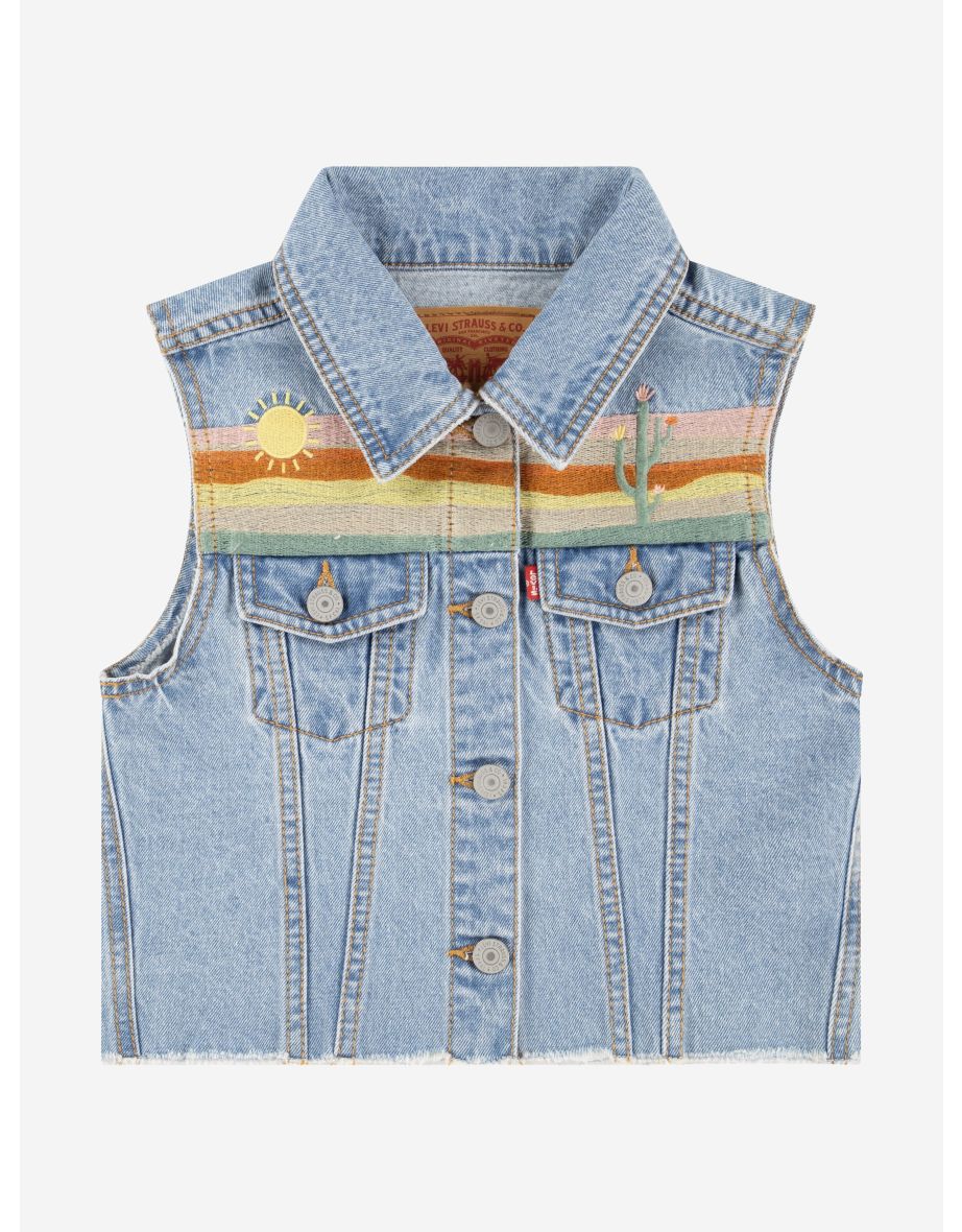 El chaleco azul bordado Levi's para niña es la elección ideal para añadir un toque de estilo a tus conjuntos informales y a tu ropa de diario.