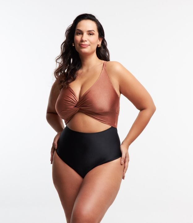 Traje de baño ligero de microfibra bicolor con busto retorcido en marrón cobrizo/negro