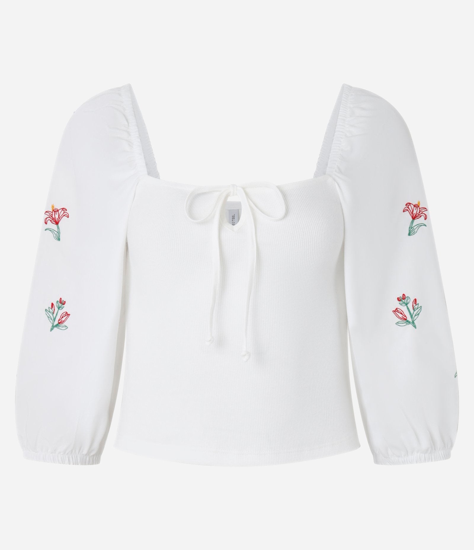 Blusa de canalé con lazo en el pecho y bordado floral blanco