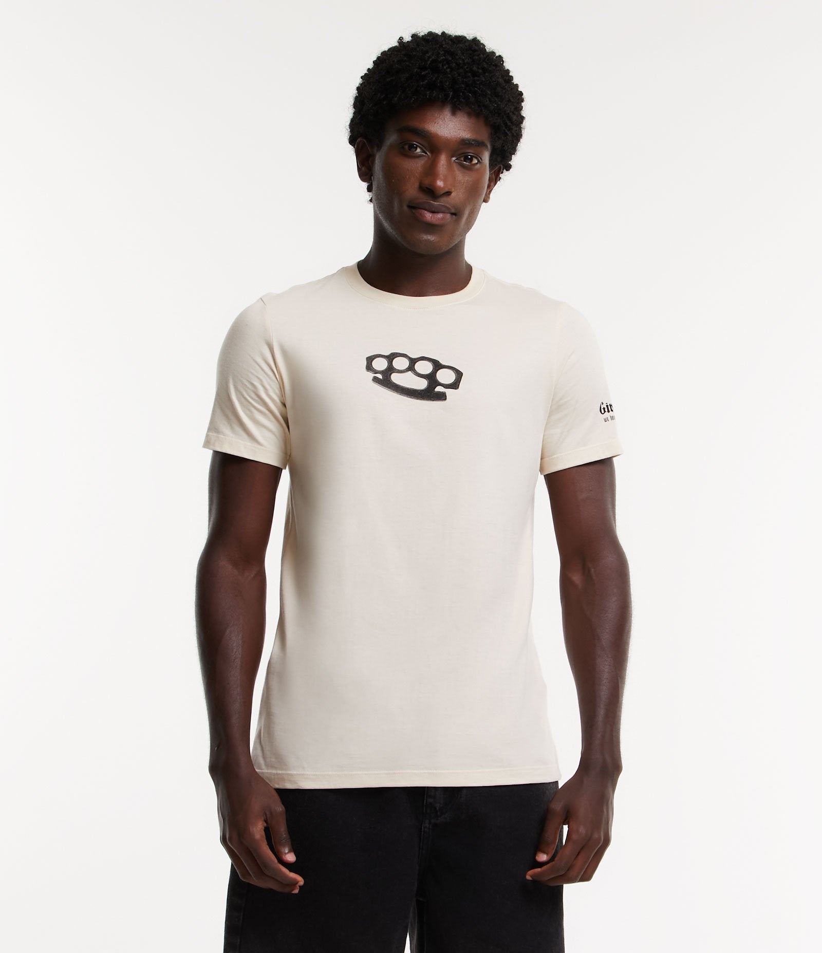 Camiseta regular fit de punto beige con estampado de nudillos de latón
