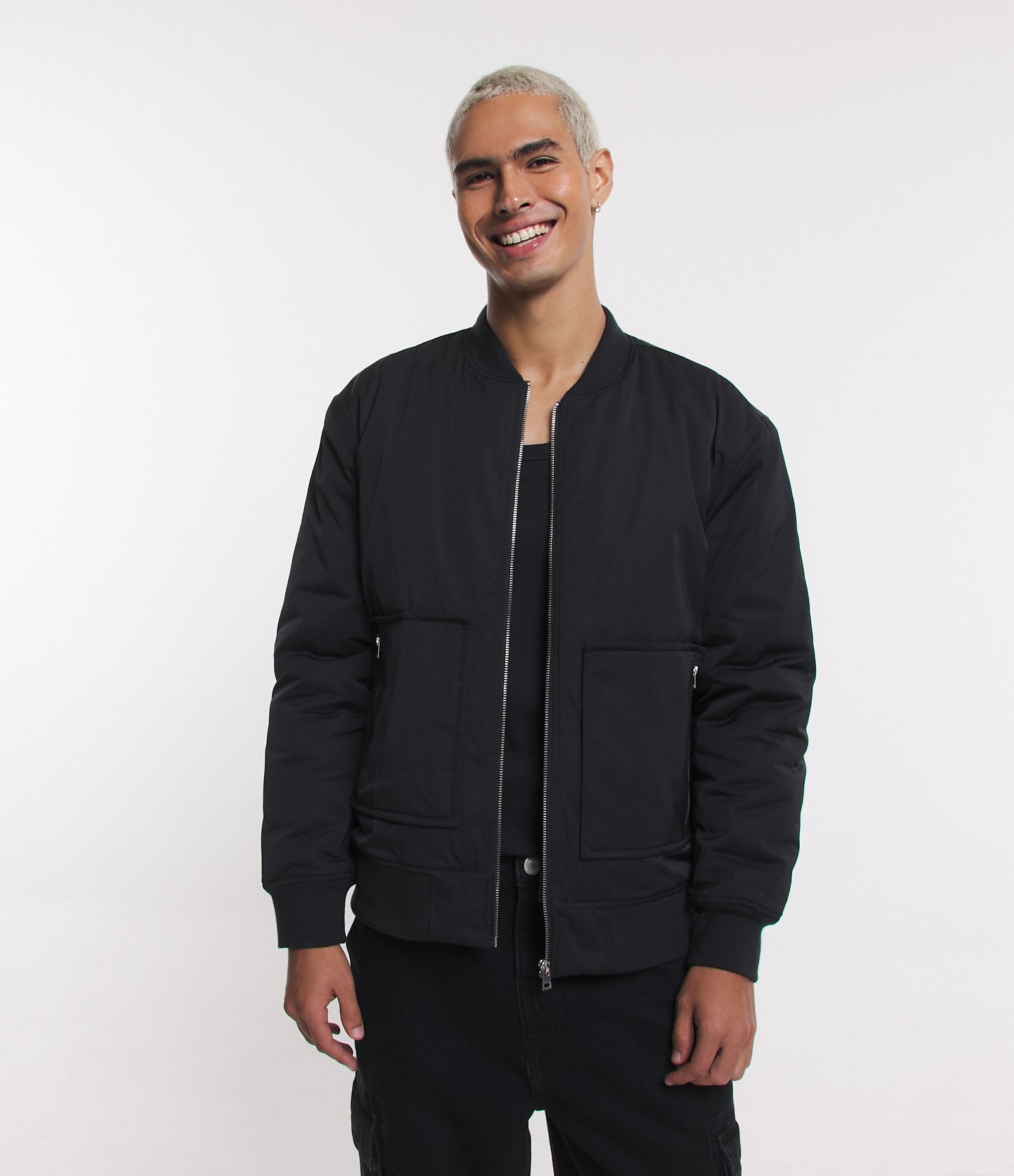 Cazadora bomber negra con cremallera resistente y bolsillo interior