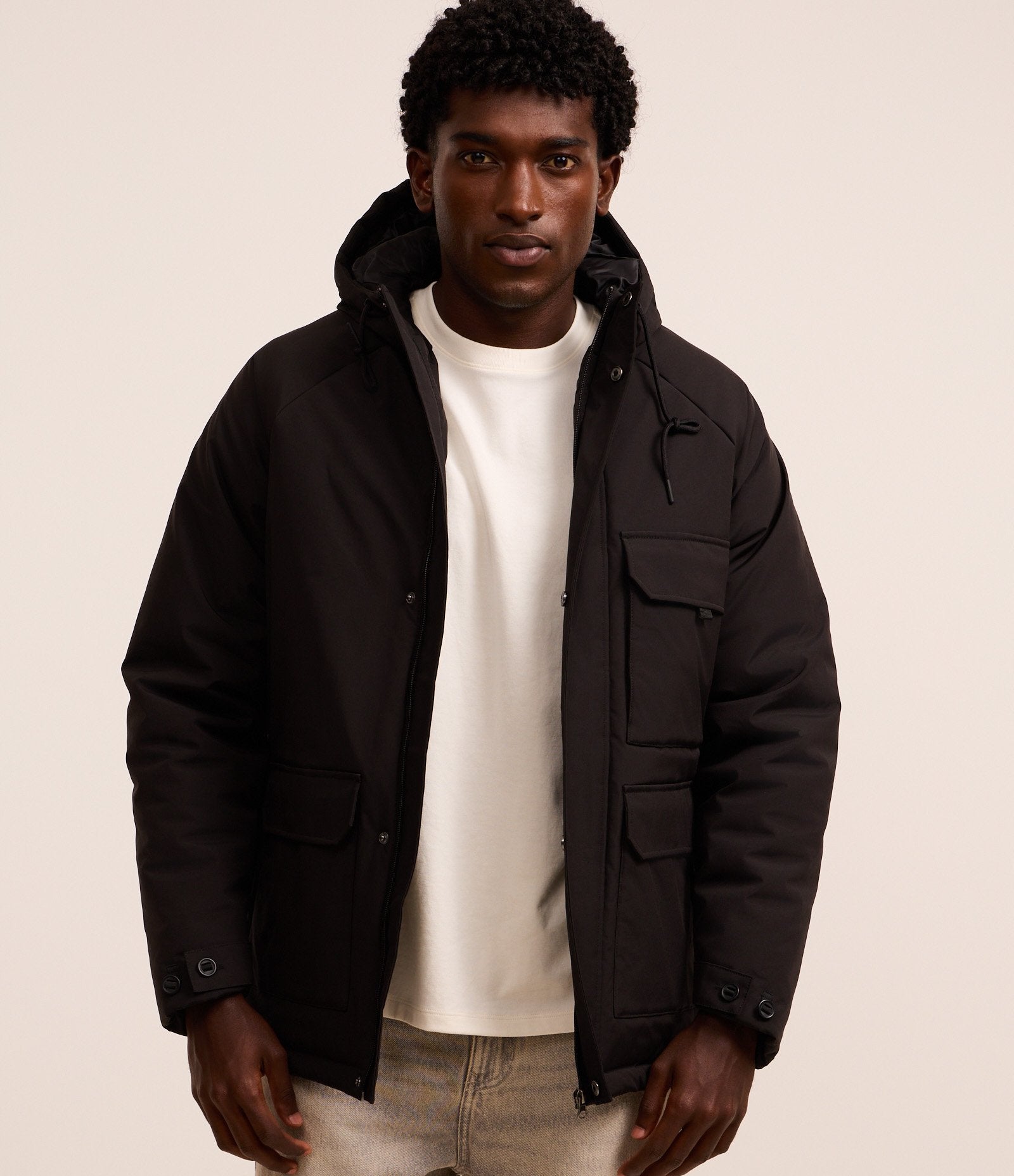 Chaqueta Parka Negra de Poliamida con Capucha y Bolsillos con Solapa