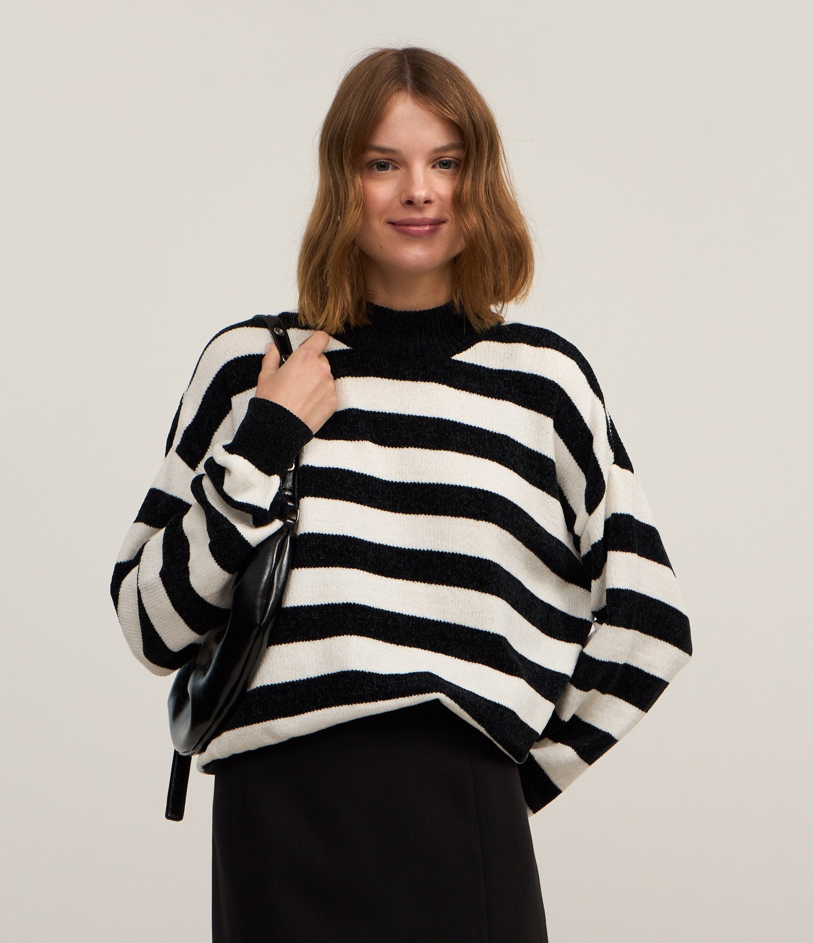 Jersey de Chenilla a Rayas con Cuello Alto en Negro/Blanco
