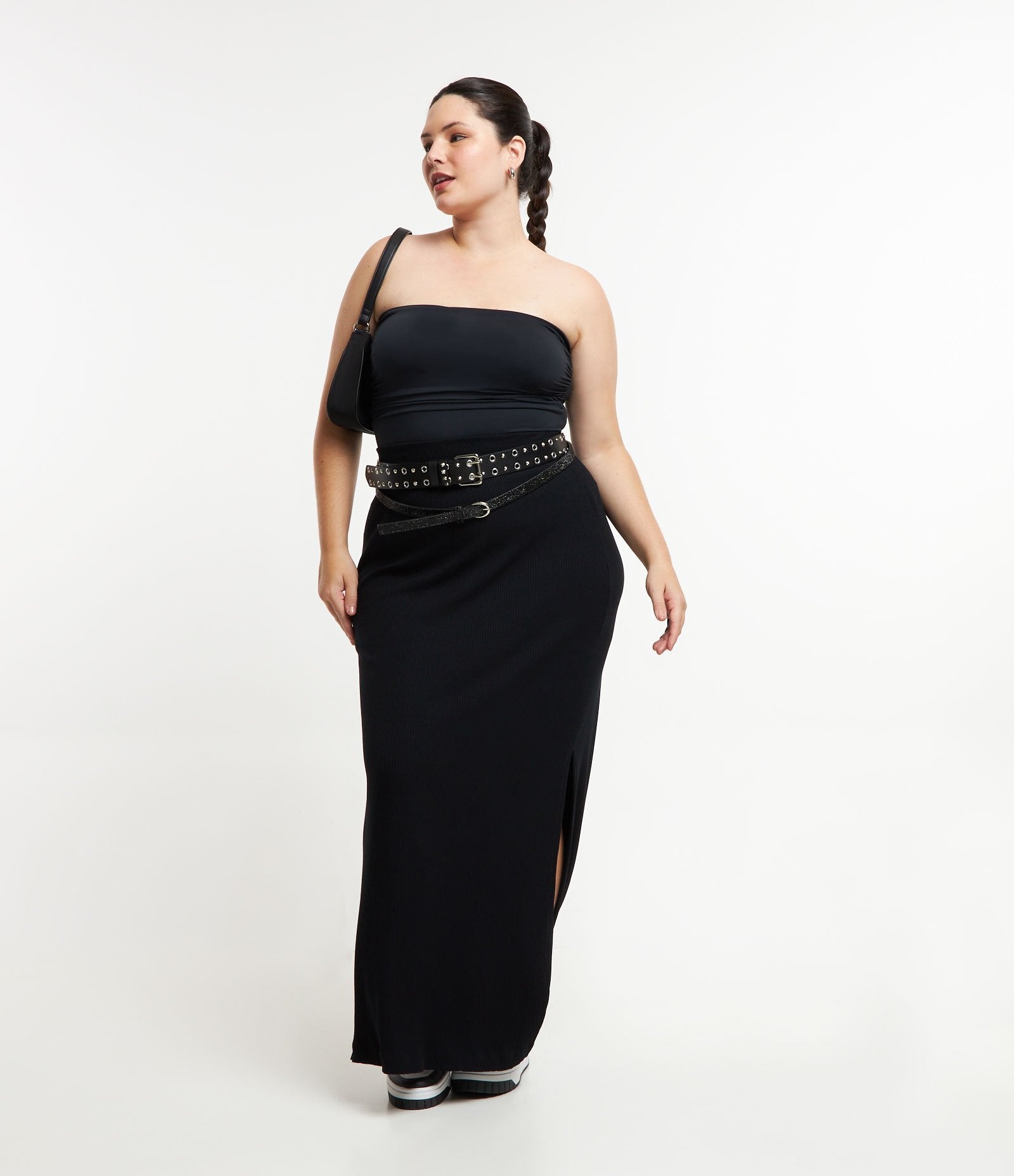 La Maxifalda acanalada negra con aberturas laterales de Ashua Curve & Tallas grandes está confeccionada para abrazar y realzar tus curvas con estilo y confianza. Ideal para cualquier ocasión, esta prenda combina a la perfección comodidad y elegancia en un diseño favorecedor.