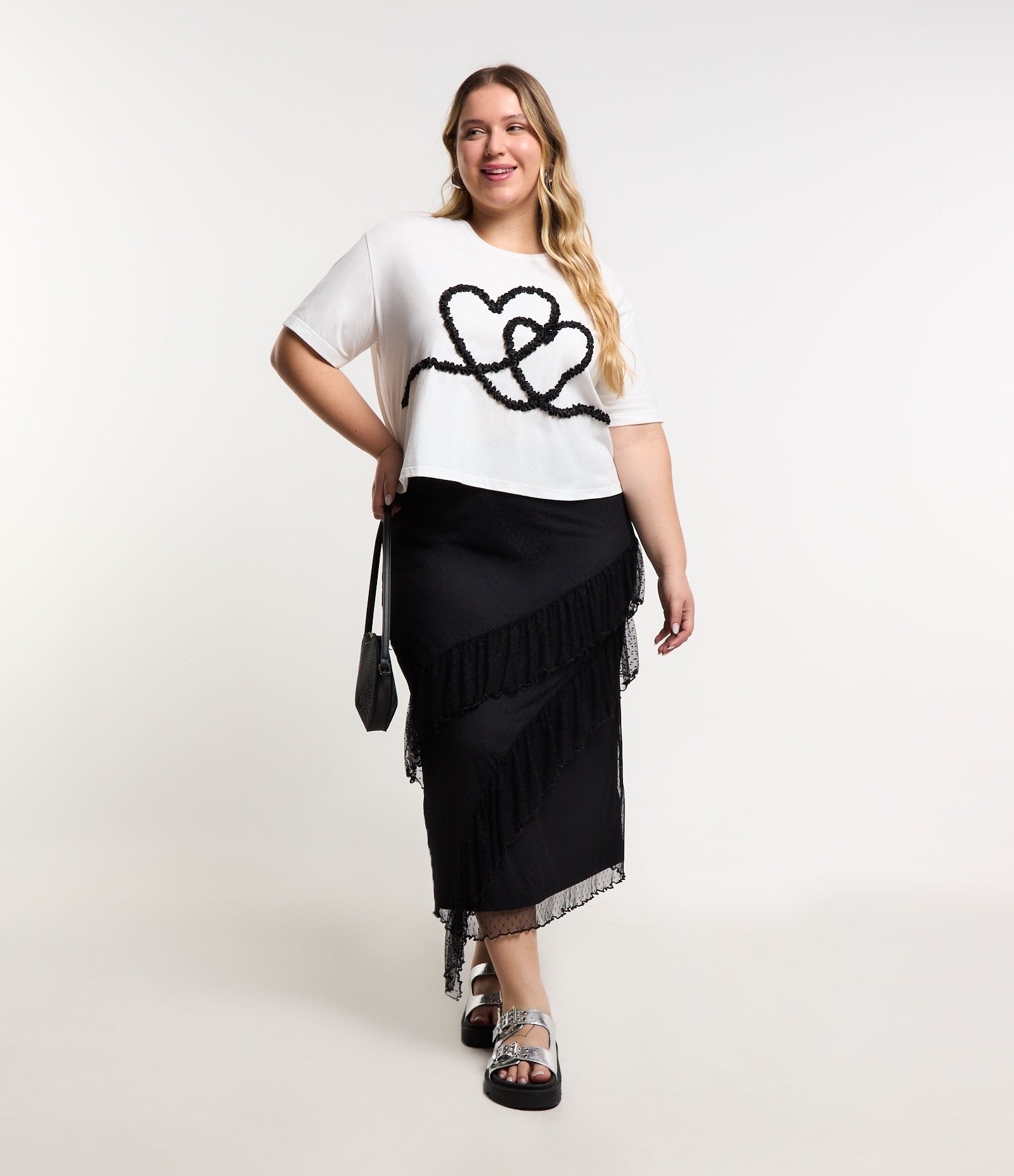 Falda Midi de Tul con Lunares, Volantes y Dobladillo Curvo - Tallas Grandes, Negro