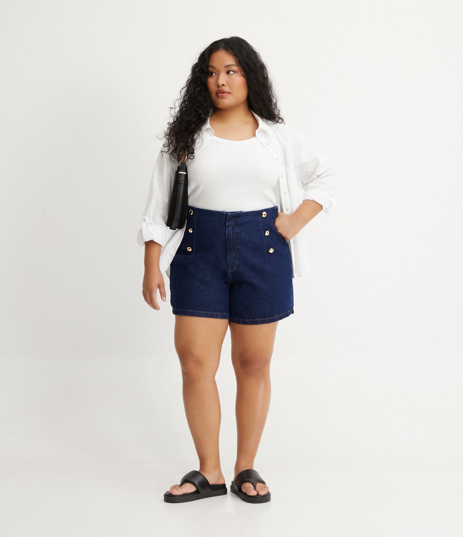 Los vaqueros cortos Curto con cintura elástica y botones delanteros en Curve & Plus Size Azul de Ashua Curve están confeccionados para celebrar las curvas con estilo y confianza. Ideal para cualquier ocasión, esta prenda combina a la perfección comodidad y elegancia en un diseño favorecedor.
