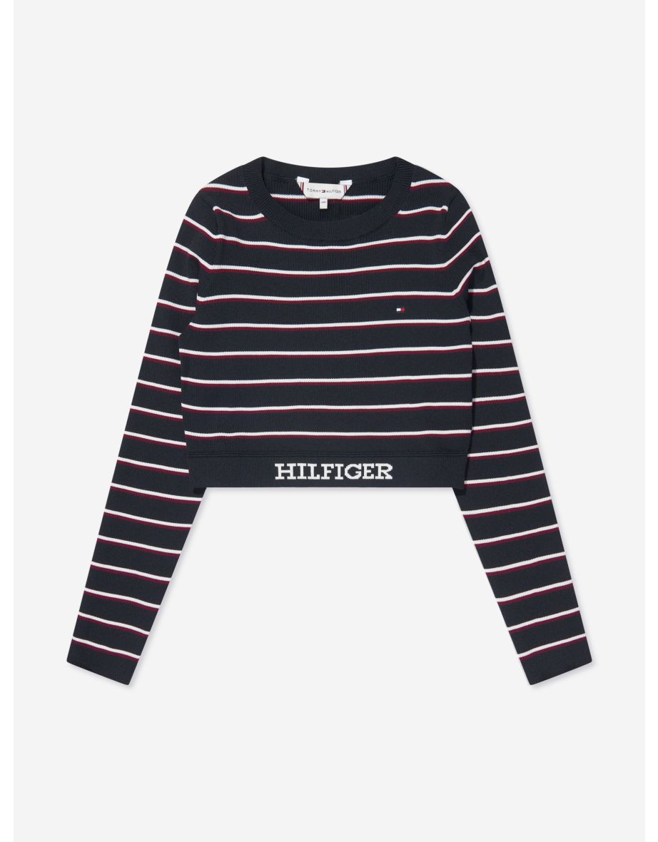 El Suéter corto a rayas globales para niña en azul marino de Tommy Hilfiger es la elección ideal para un estilo casual sin esfuerzo y para llevar a diario.