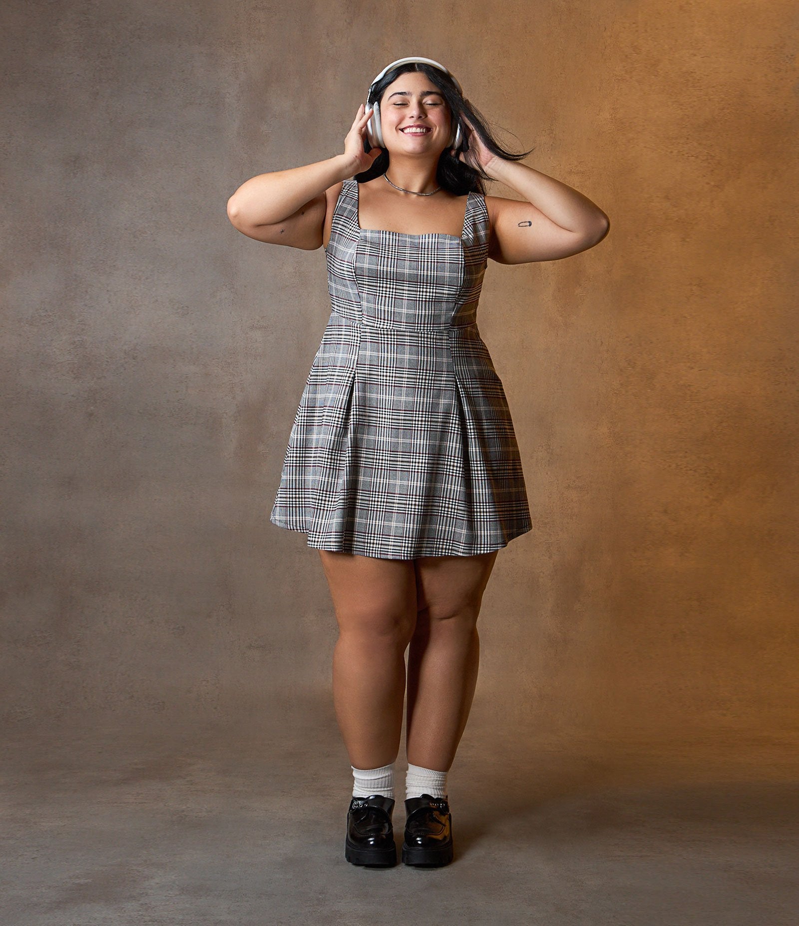 Vestido Corto a Cuadros con Pliegues, Curvas y Tallas Grandes, Multicolor