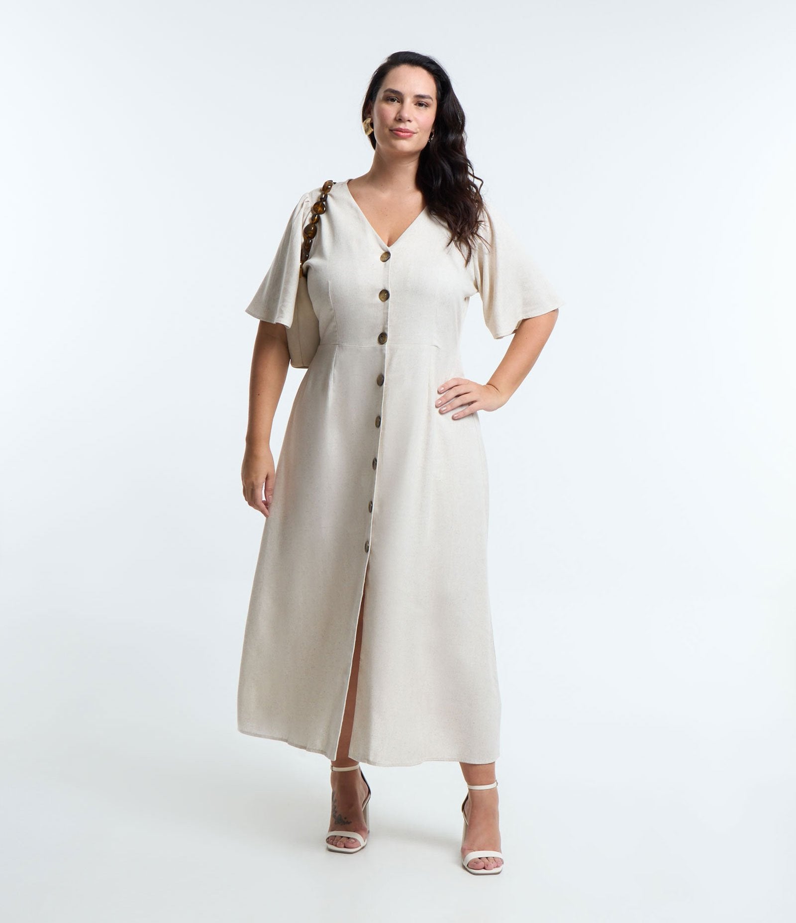 El Vestido Midi Beige de Lino y Viscosa con Botones de Ashua Curve & Plus Size está confeccionado para celebrar las curvas con estilo y confianza. Ideal para cualquier ocasión, esta prenda combina a la perfección comodidad y elegancia en un diseño favorecedor.