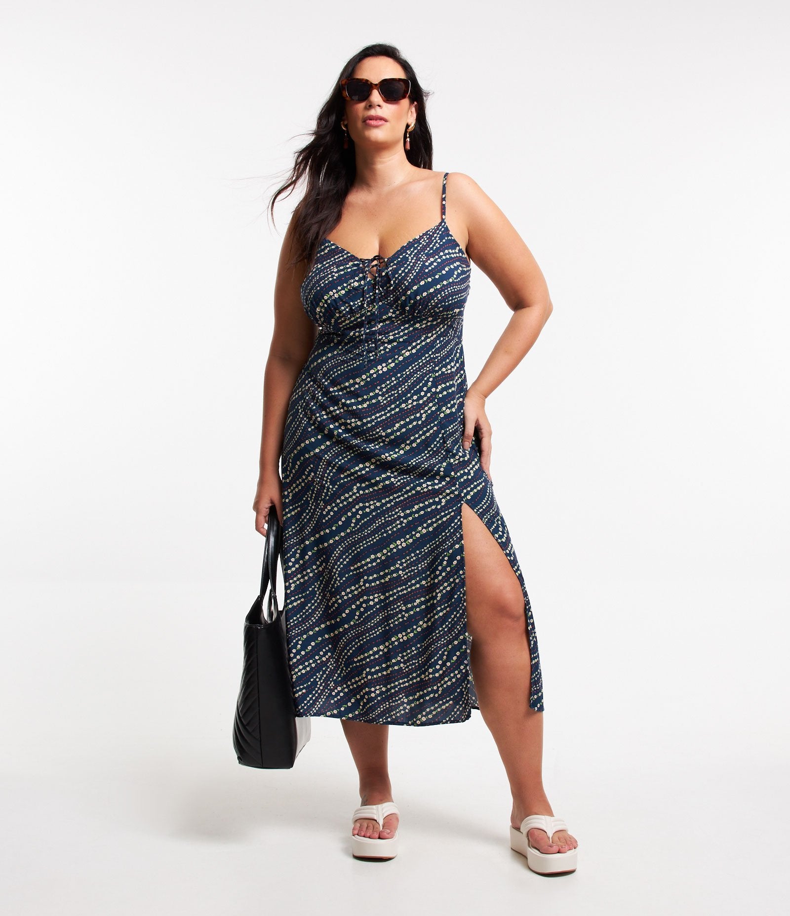 El Vestido Floral Liberty Midi de viscosa con lazada en el busto y abertura - Curve & Tallas grandes en azul marino de Ashua Curve está confeccionado para celebrar tus curvas con estilo y confianza. Ideal para cualquier ocasión, este vestido combina sin esfuerzo comodidad y elegancia en un diseño favorecedor.