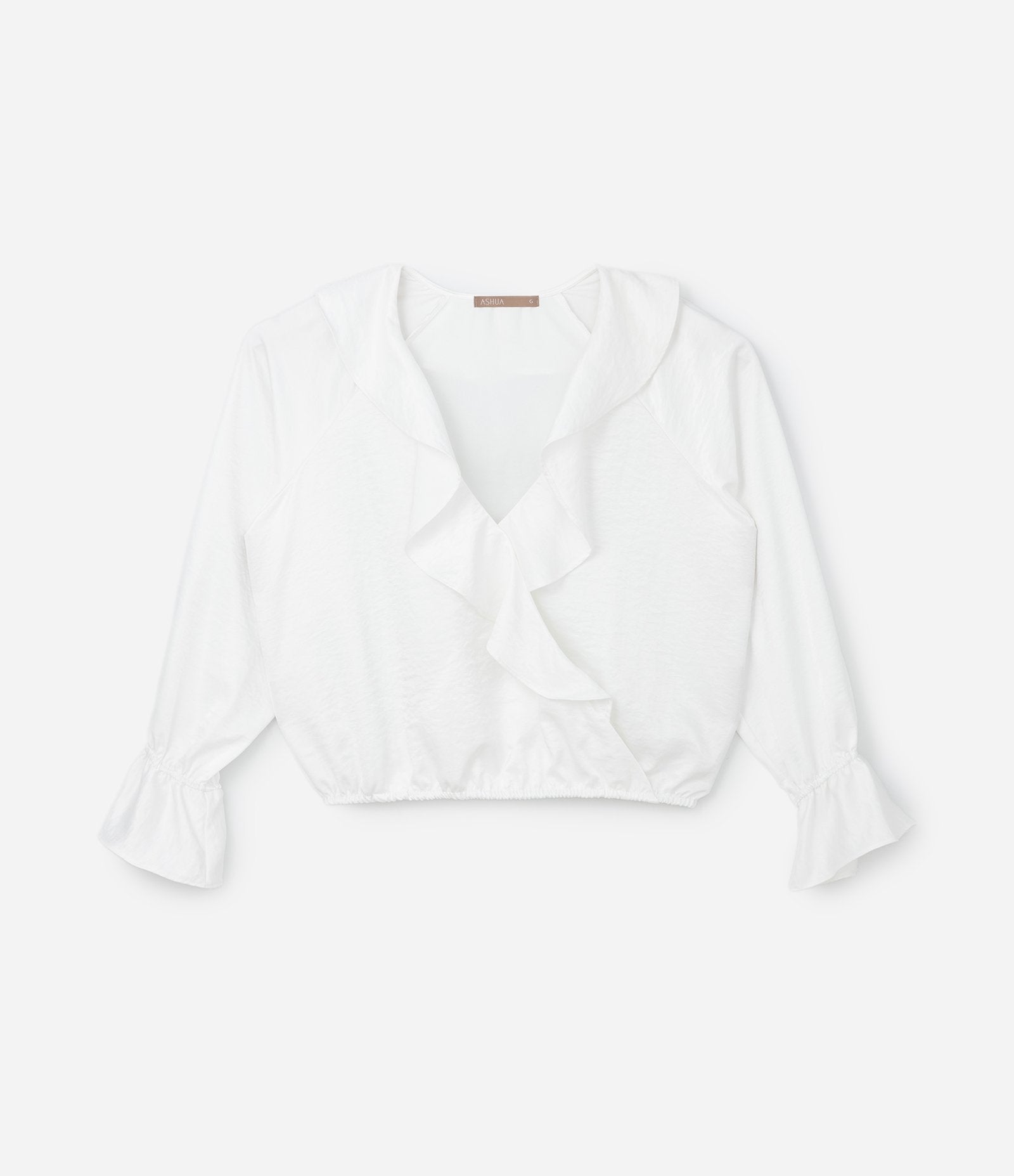 Camicetta a portafoglio in raso bianco con volant, taglie forti e taglie forti