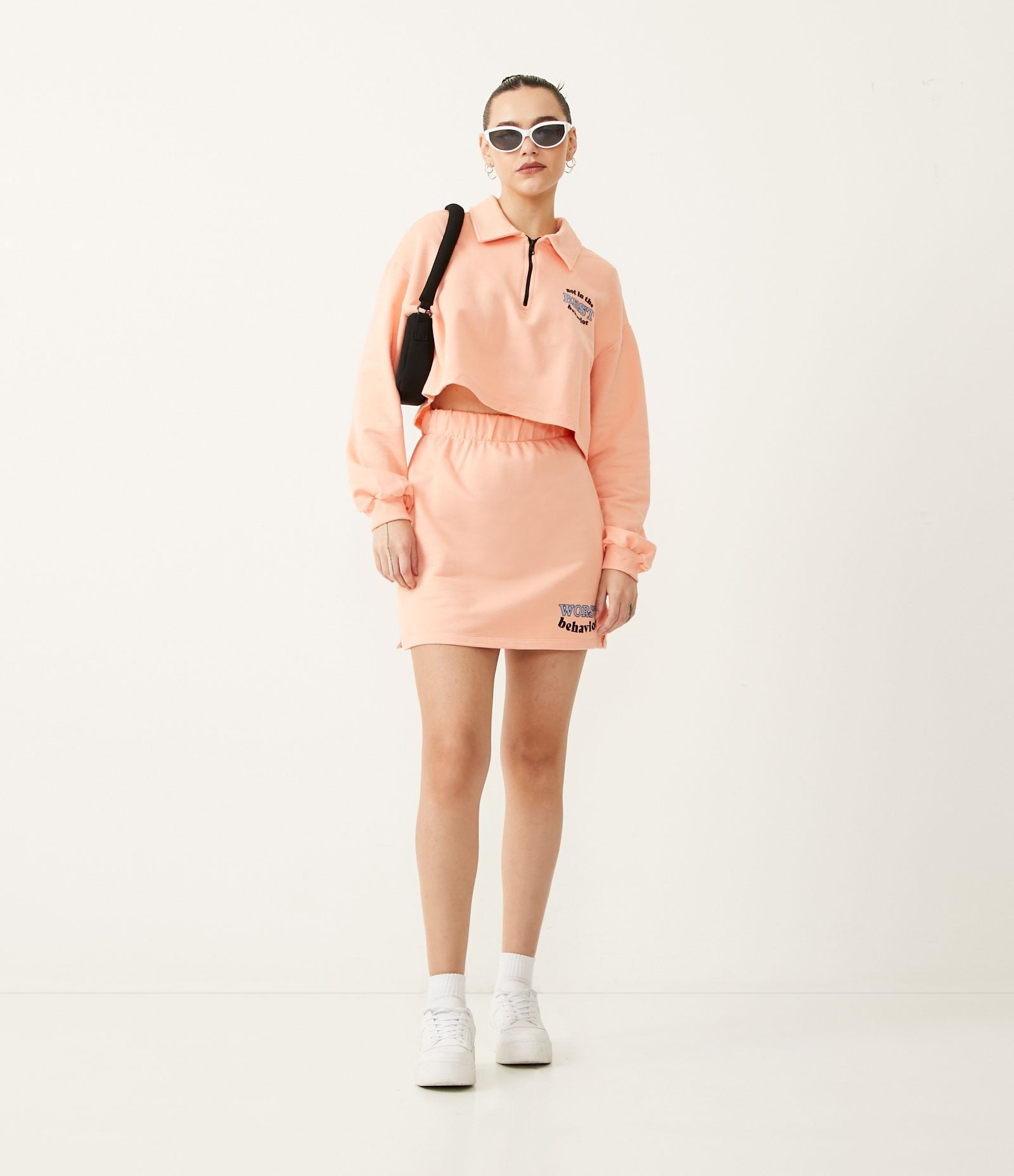 Gonna corta in tessuto felpato rosa con scritte "Worst Behavior