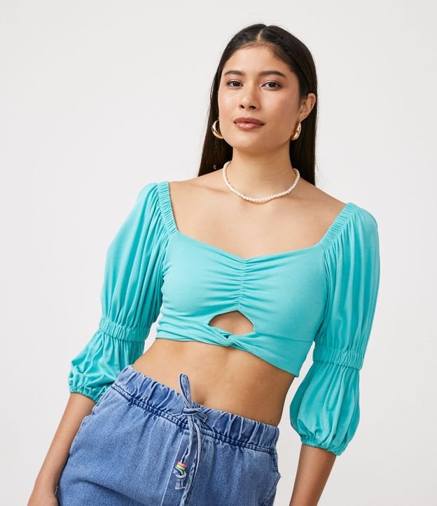 Camicetta cropped in crêpe con scollo a cuore e maniche lunghe a palloncino - Blu