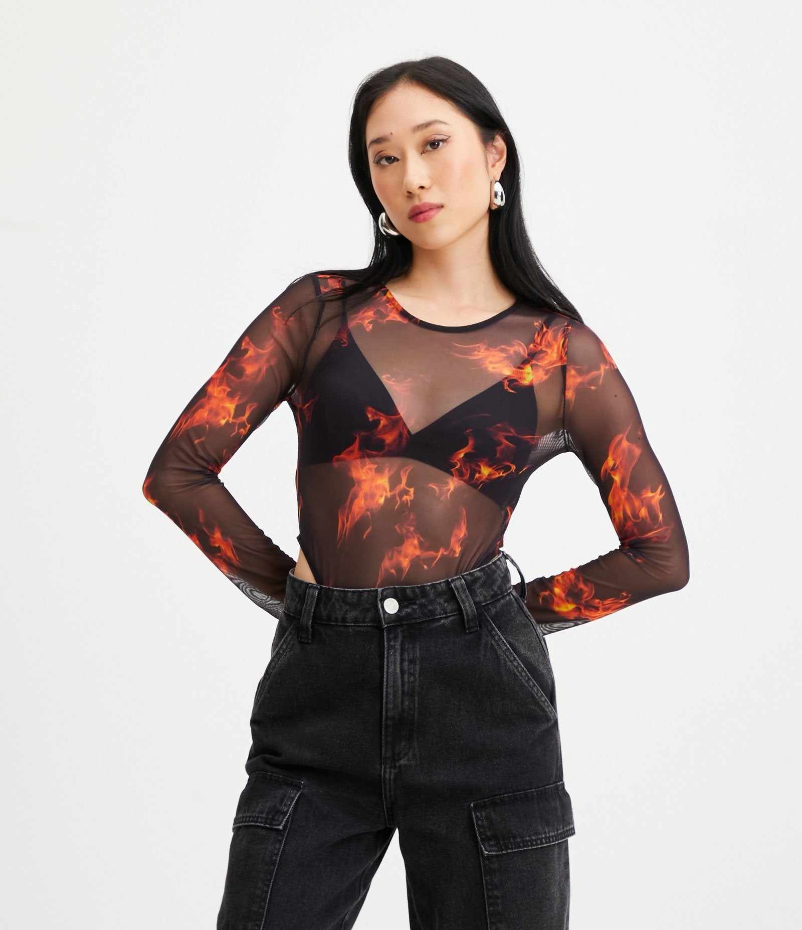 Body trasparente con maniche lunghe e stampa a fiamme nere