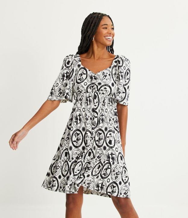 Vestito in viscosa con maniche corte e stampa a volo leggero in bianco sporco