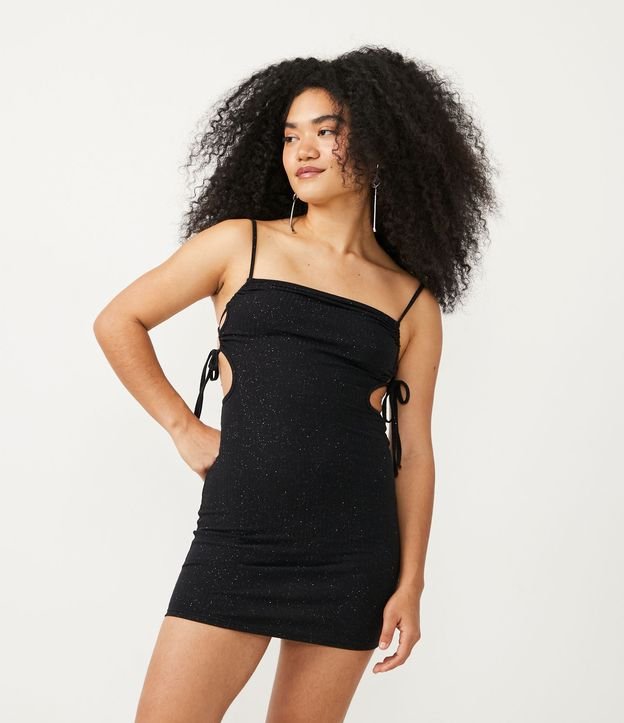 Abito corto nero a coste con spalline, ritagli e lucentezza