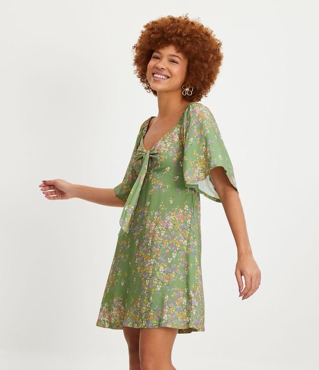 Abito in viscosa con fiocco sul seno e stampa floreale verde