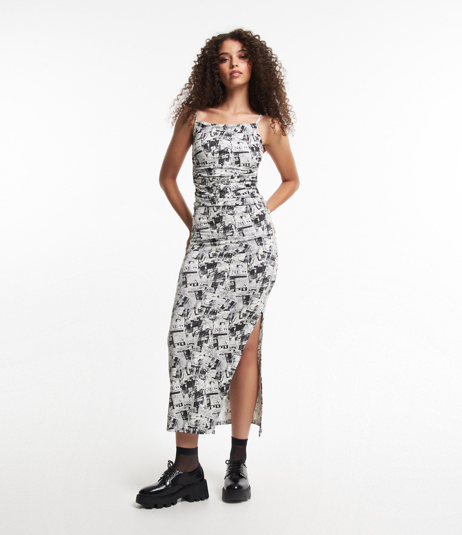 Nuovo abito midi in tessuto jersey con stampa giornale bianco/nero