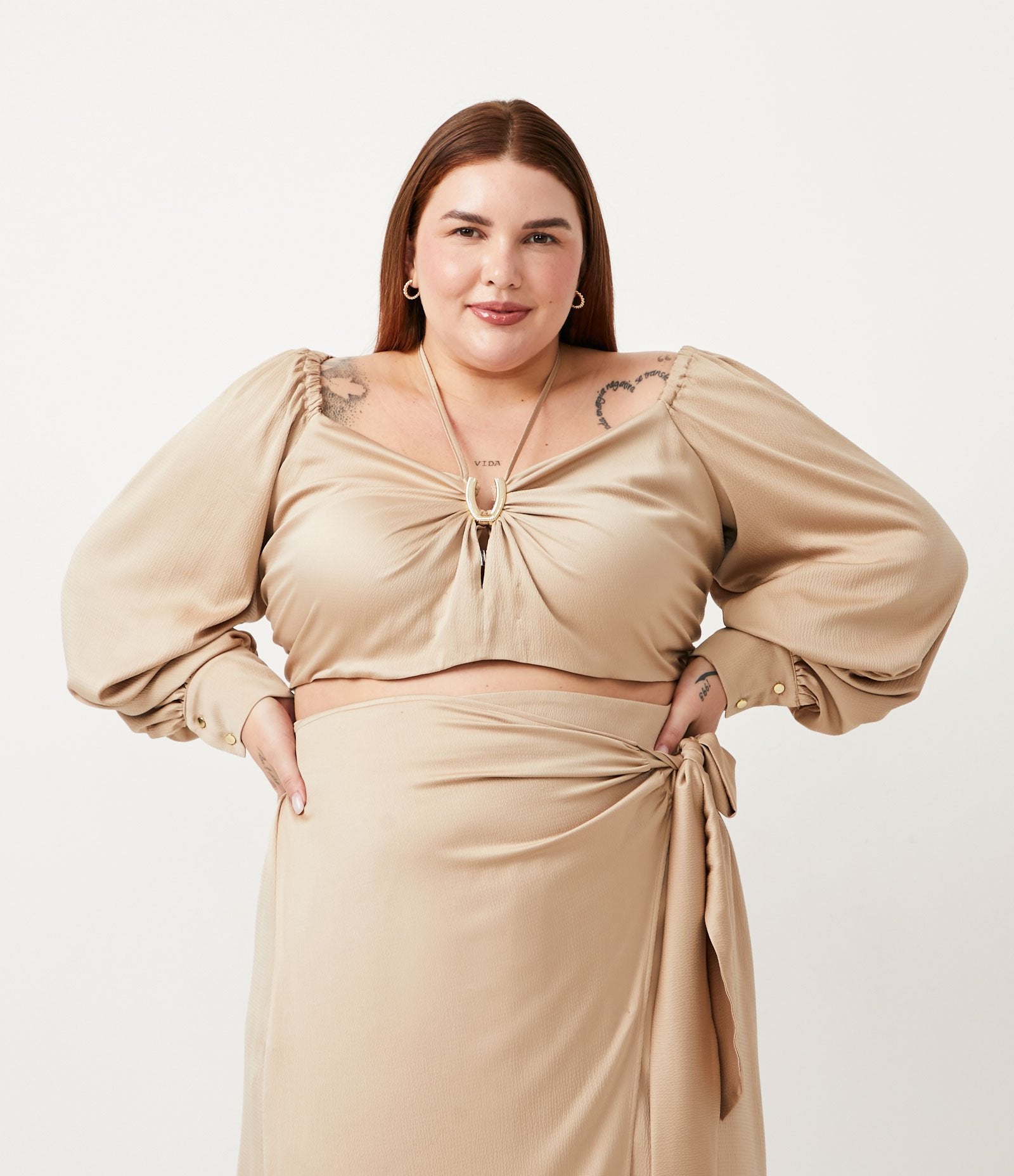 Camicetta cropped in crepe satinato beige con dettaglio ad anello sulla scollatura - Curve e taglie forti