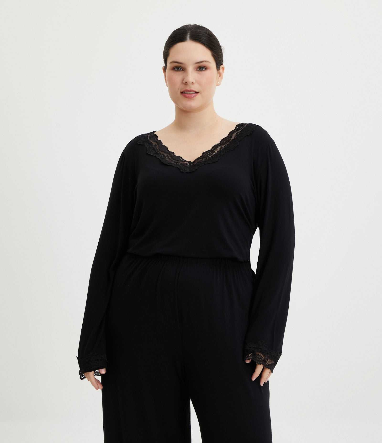 Top pigiama in viscosa nera con scollo in pizzo, taglie forti e taglie forti