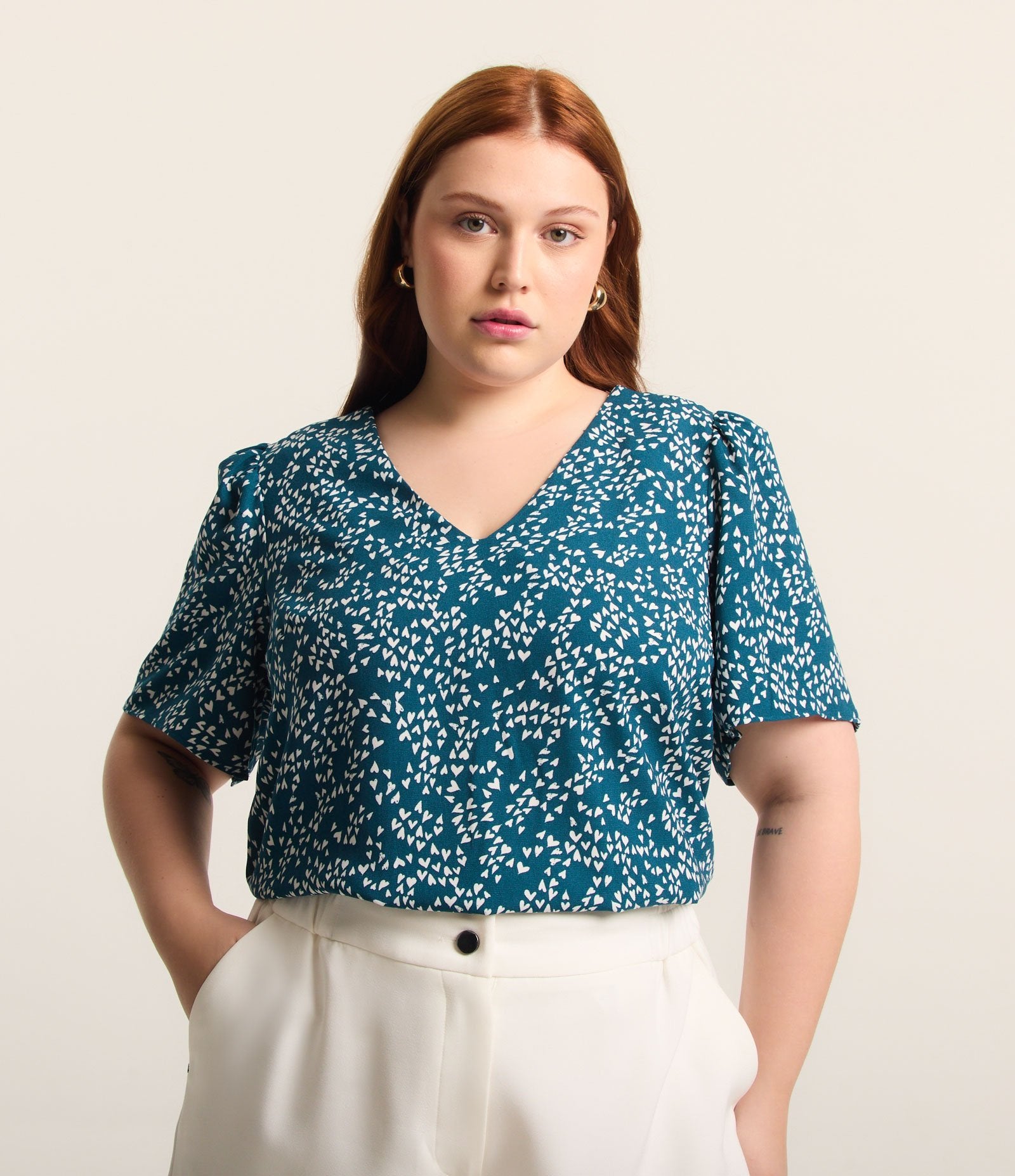 Camicetta in crepe verde con stampa a cuore e maniche a sbuffo - Curve e taglie forti