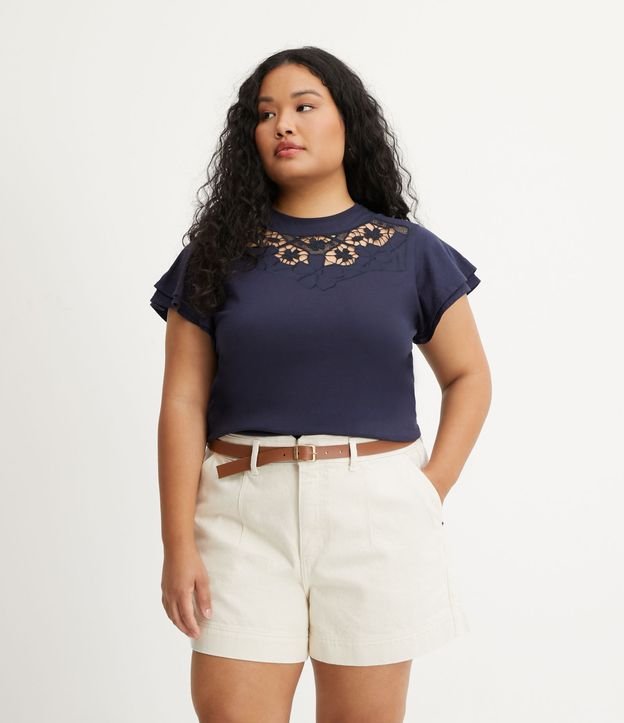Camicetta blu Curve e taglie forti in tessuto semi-magliato con dettaglio in pizzo sul seno