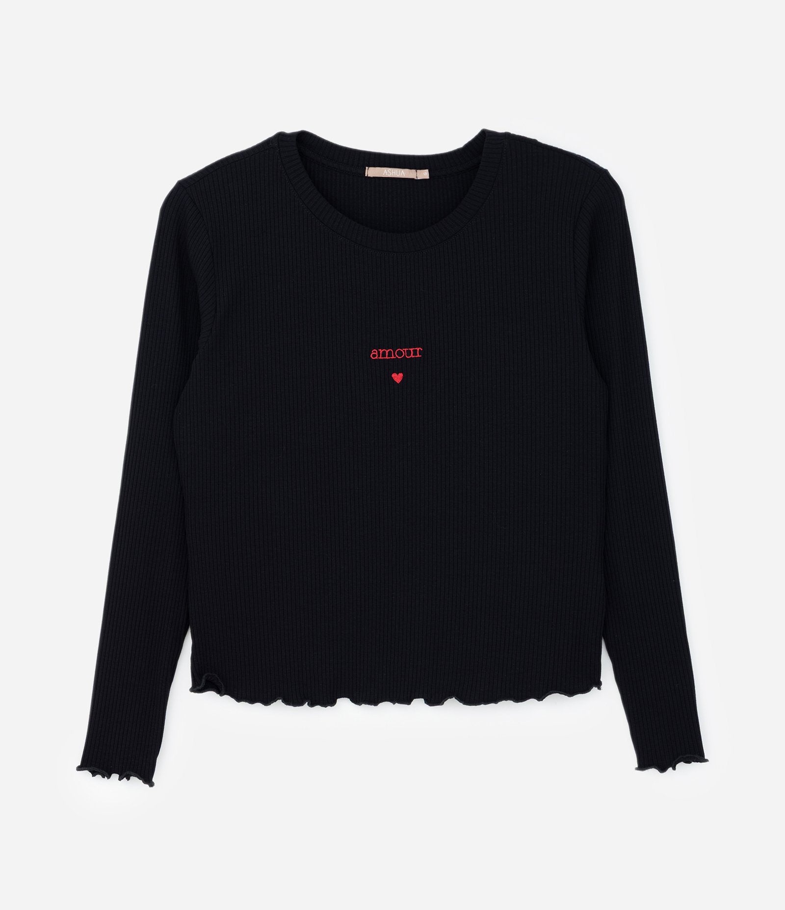 Camicetta a coste con ricamo "Amour", taglie forti e taglie forti, nero