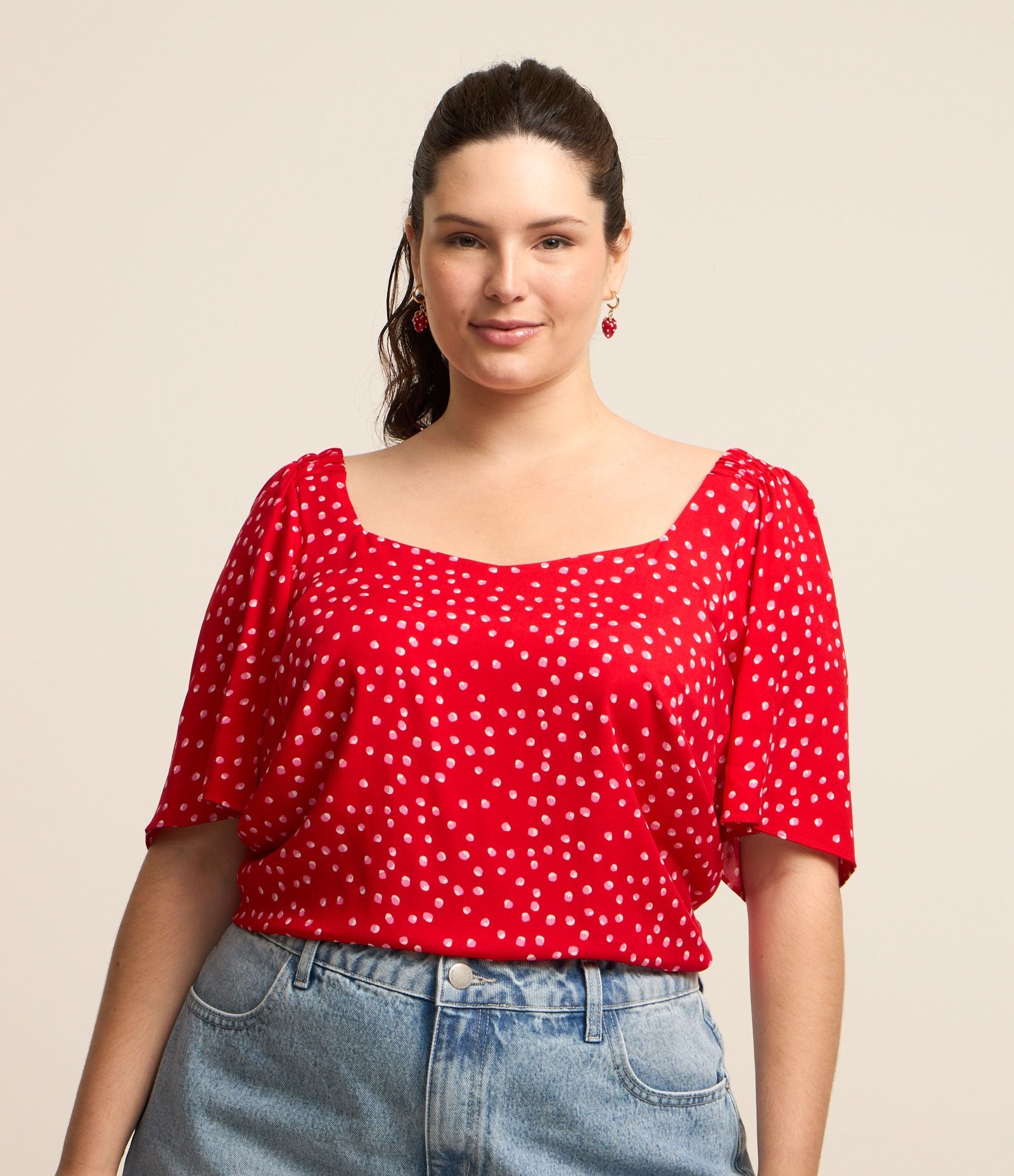 La blusa in viscosa con stampa Pintinhas di Ashua Curve & Plus Size Red è realizzata per celebrare le tue curve con stile e sicurezza. Ideale per ogni occasione, questo capo combina perfettamente comfort ed eleganza in un design lusinghiero.
