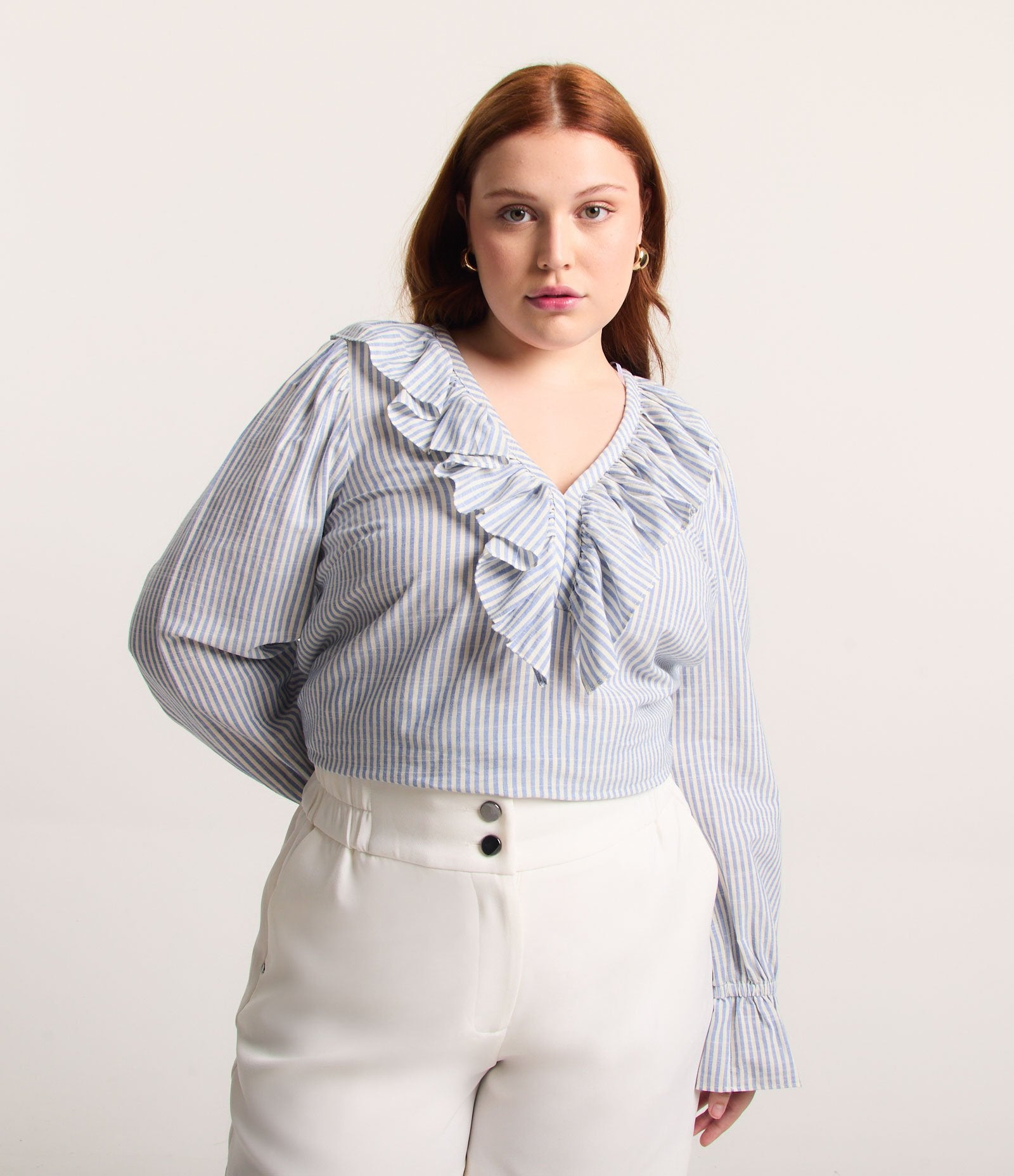 La blusa in viscosa a righe con scollo e polsini arricciati in Curve & Plus Size White/Blue di Ashua Curve è realizzata per abbracciare e valorizzare le tue curve con stile e sicurezza. Ideale per ogni occasione, questo capo combina perfettamente comfort ed eleganza in un design lusinghiero.