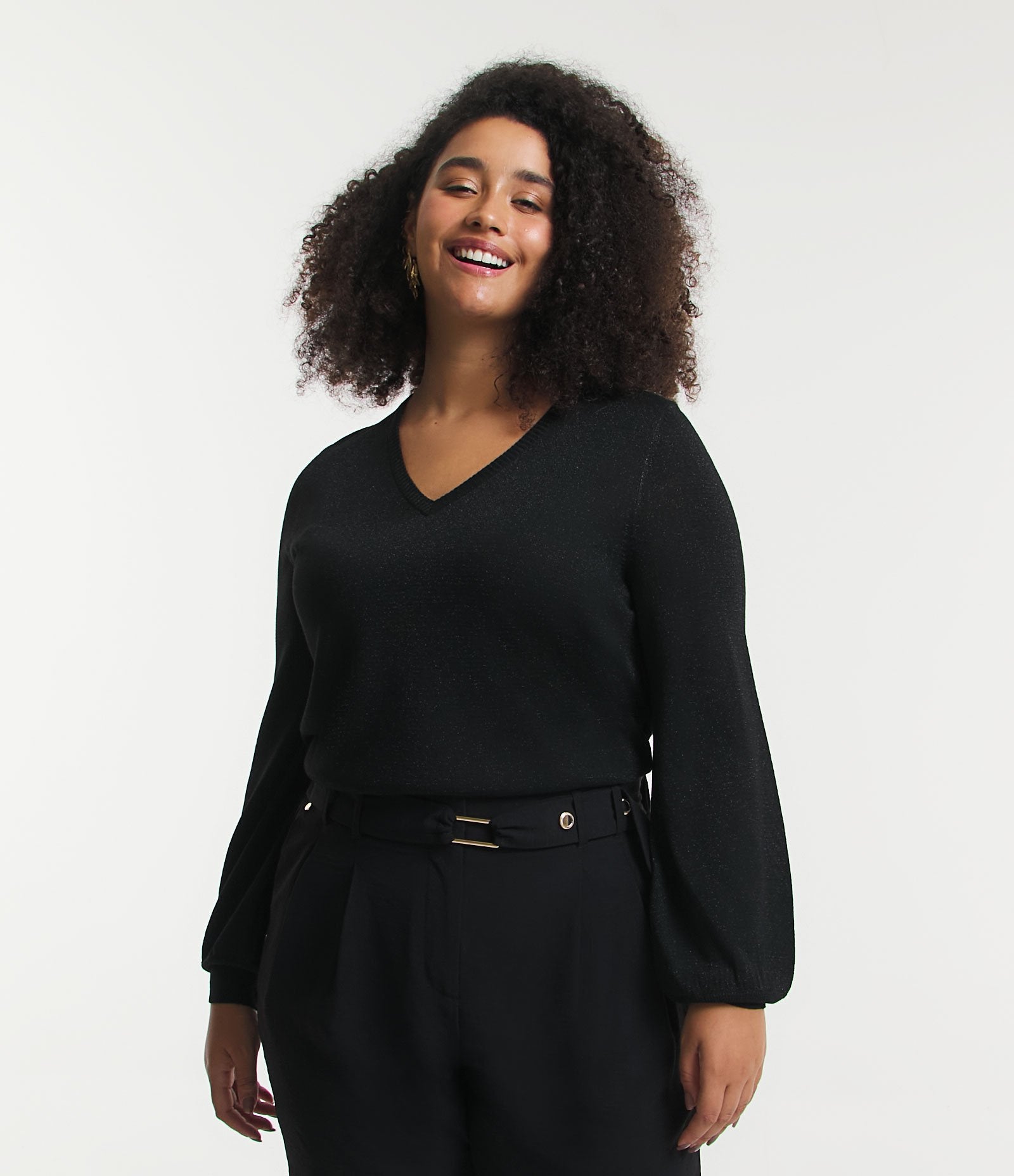 Camicetta nera con maniche a sbuffo in viscosa metallizzata - Curve e taglie forti