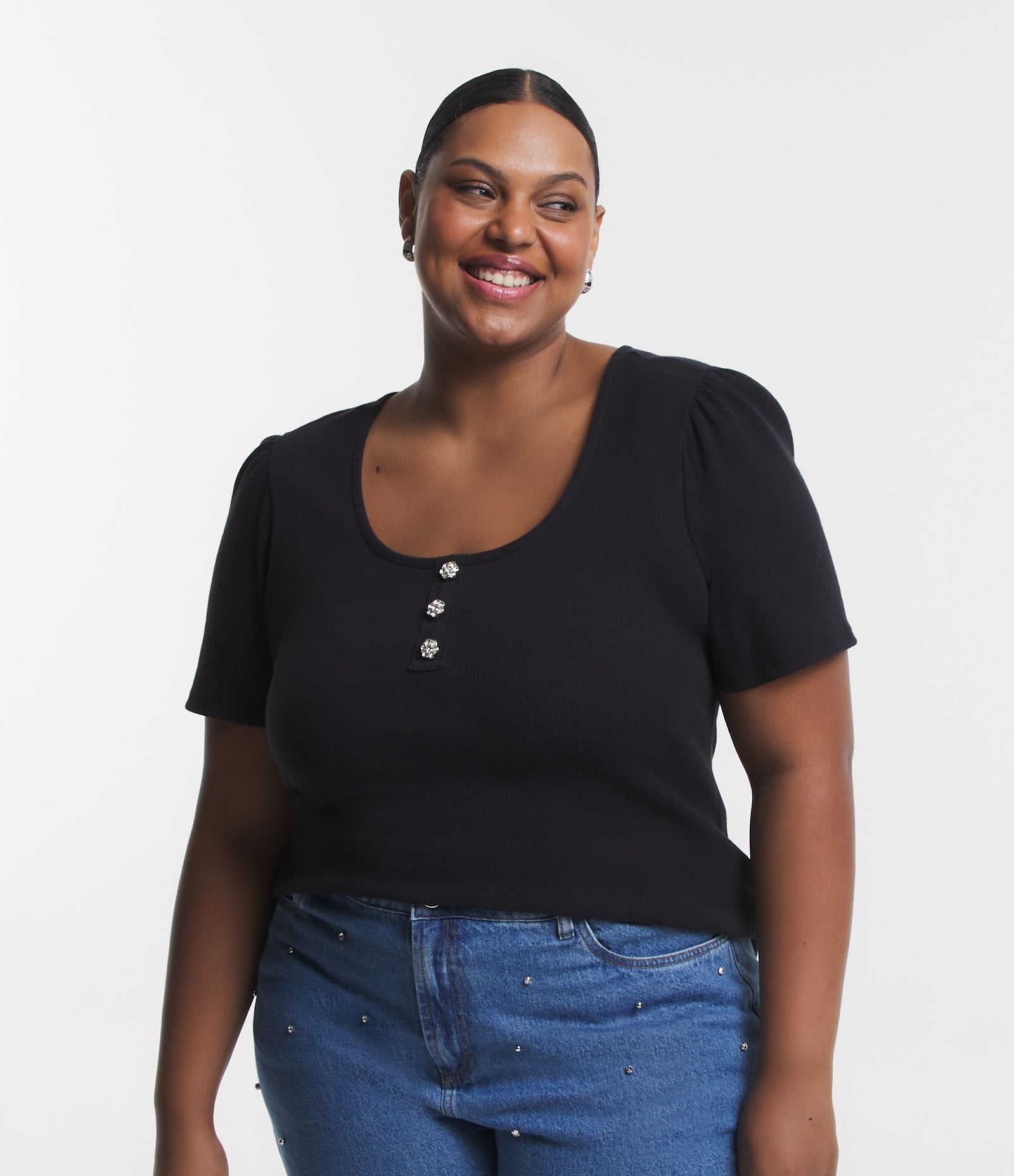 Top a maniche corte in suedine con bottoni di strass, Curve e taglie forti, nero