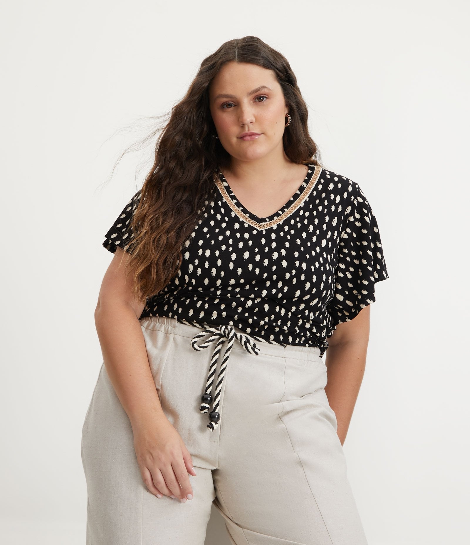 La blusa a manica corta in crepe di viscosa con dettaglio sullo scollo in Curve & Plus Size Black di Ashua Curve è realizzata per celebrare le curve con stile e sicurezza. Ideale per ogni occasione, questo capo combina perfettamente comfort ed eleganza in un design lusinghiero.