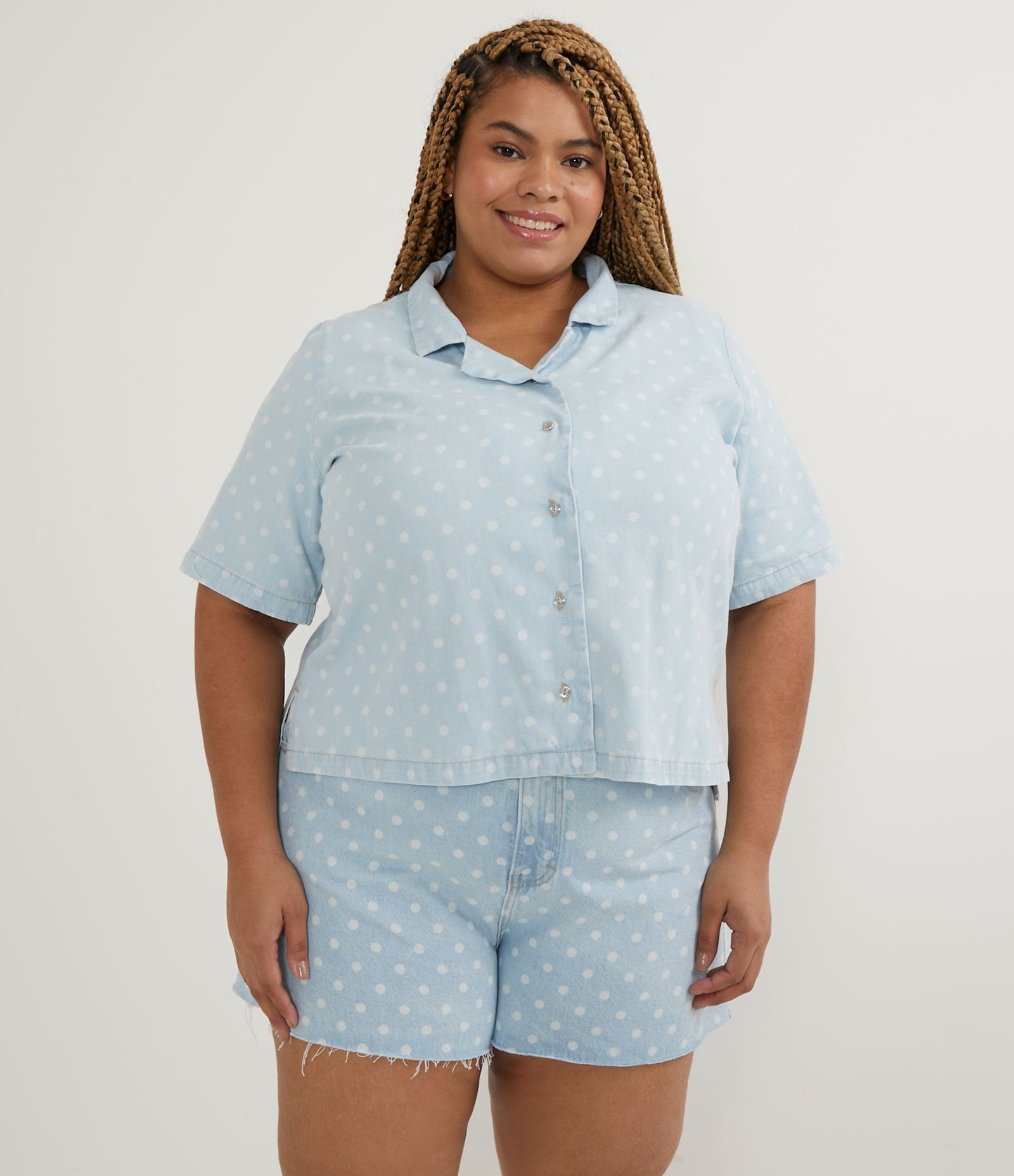 Camicia in denim blu con stampa a pois - Curve e taglie forti